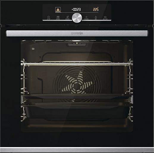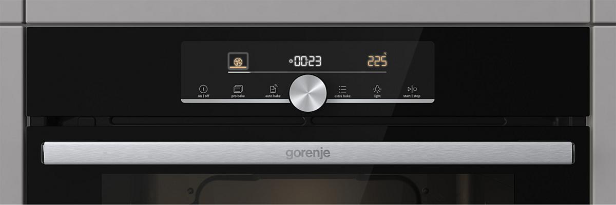 Multifunkční trouba Gorenje s tlumeným zavíráním dvířek a pyrolytickým čištěním. Energetická třída A+, 22 programů a celkový objem 77 litrů.