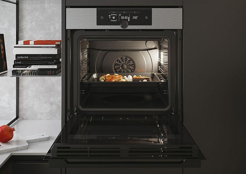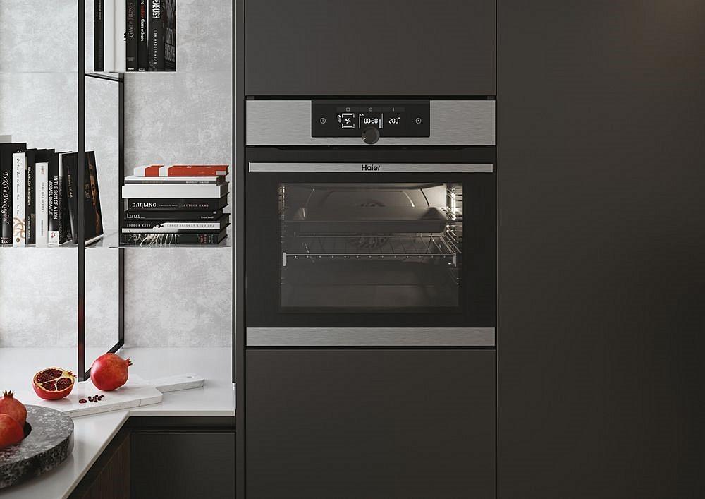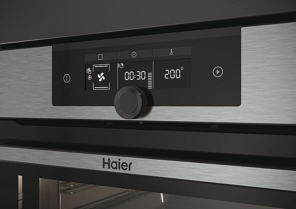 Vestavná trouba Haier s displejem a funkcí pravého horkého vzduchu. Energetická třída A+ a celkový vnitřní objem 70 litrů.