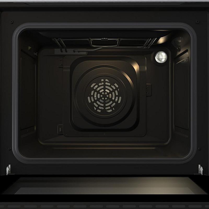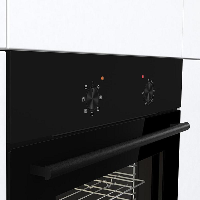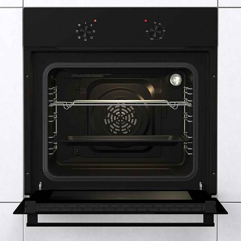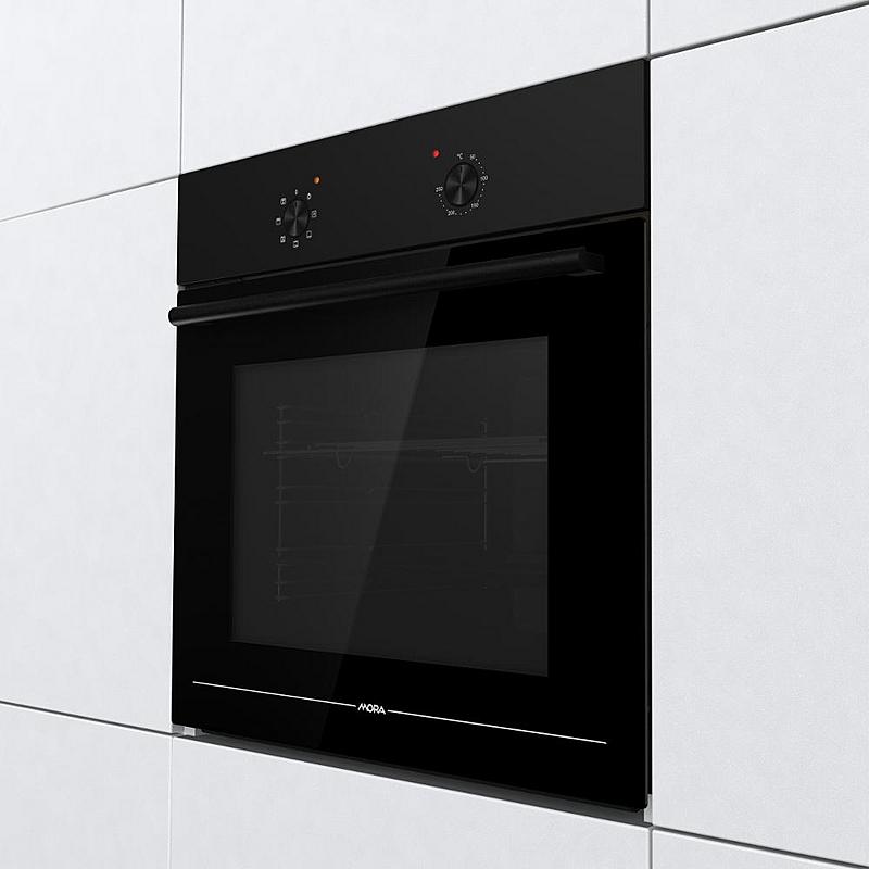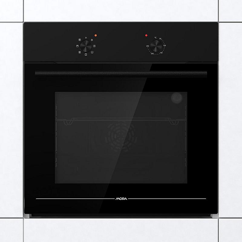 Vestavná trouba Mora s grilem, ventilátorem a funkcí rozmrazování. Energetická třída A a zamačkávací knoflíky.