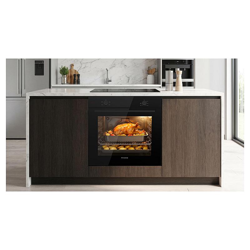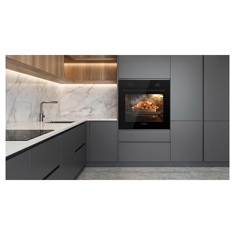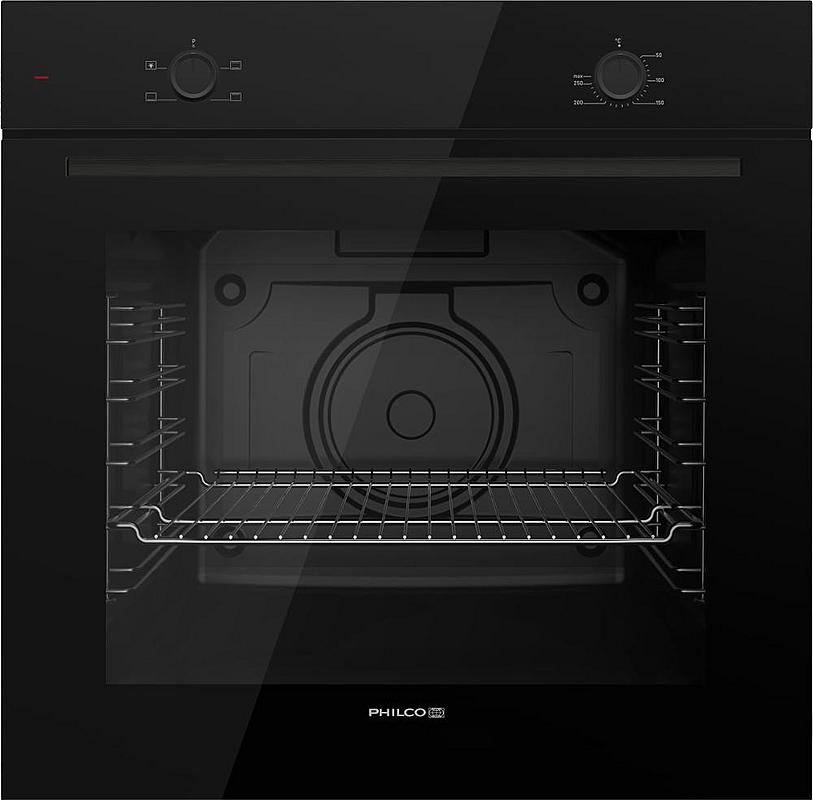 Vestavná trouba Philco s mechanickým ovládáním, 3 programy, funkcí čištění parou a časovačem. Energetická třída A, halogenové osvětlení a dvojnásobné prosklení dvířek.