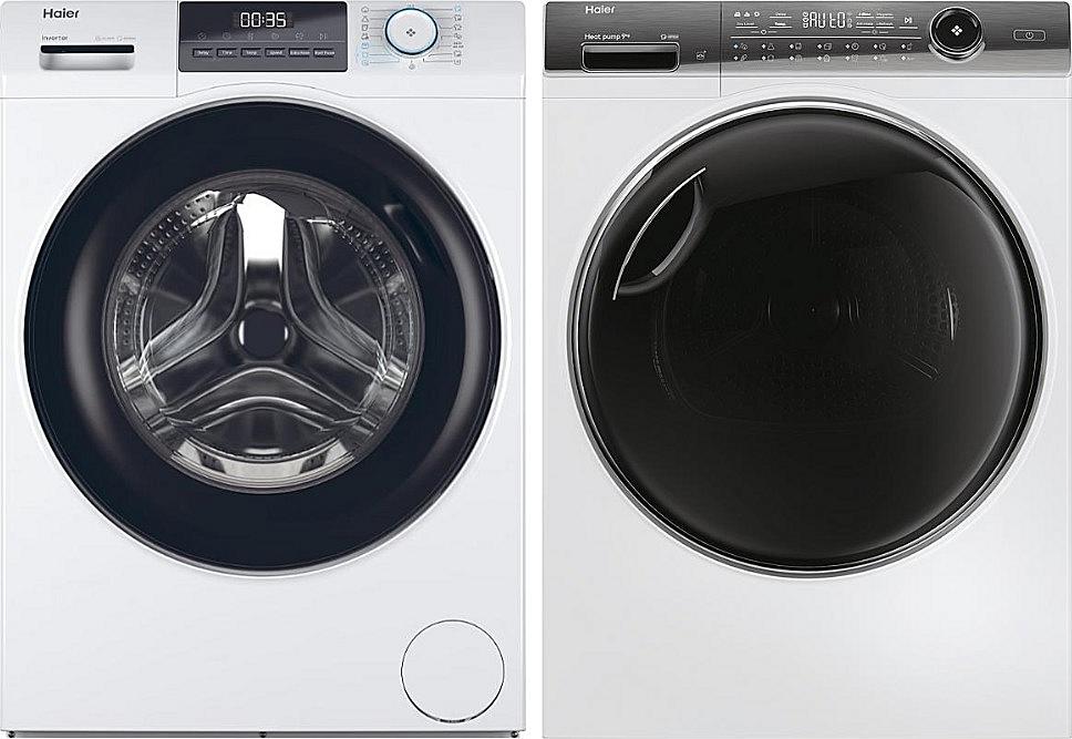 Set předem plněné pračky a kondenzační sušičky Haier na 9 kg prádla. Tepelné čerpadlo, invertorový motor a senzor sušení.