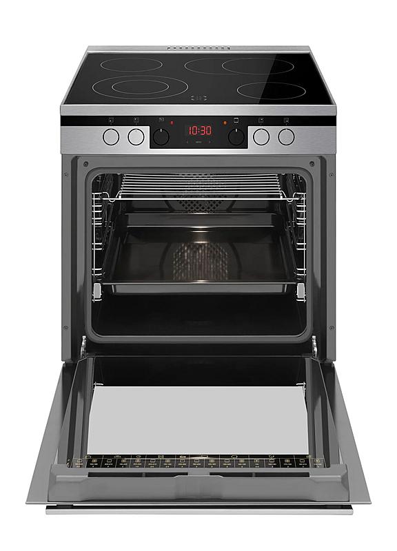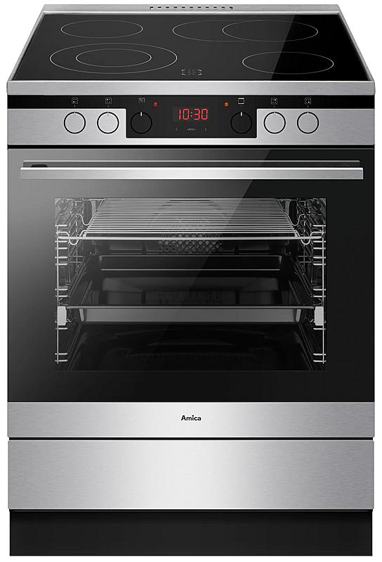 Sklokeramický sporák Amica s šířkou 60 cm, 11 funkcemi trouby a horkým vzduchem. Rychlé předehřátí a energetická třída A.