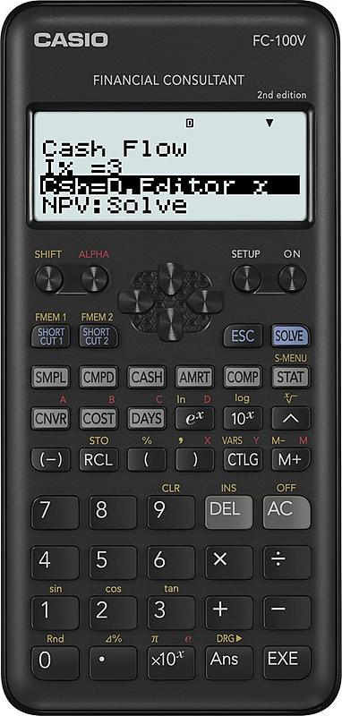 Finanční kalkulátor Casio s funkcí statistika a základními matematickými výpočty.