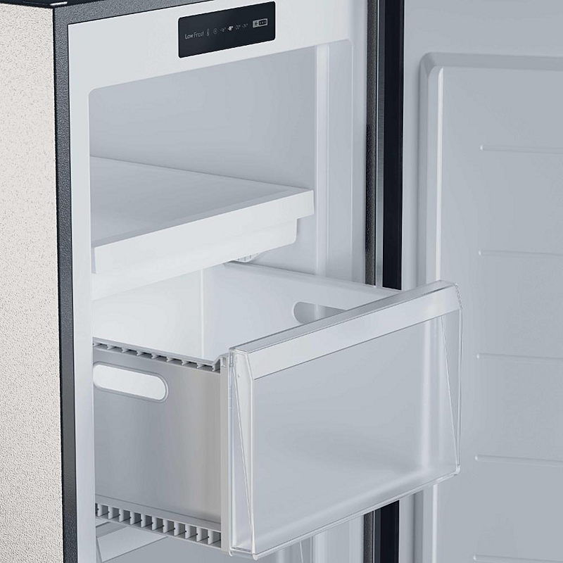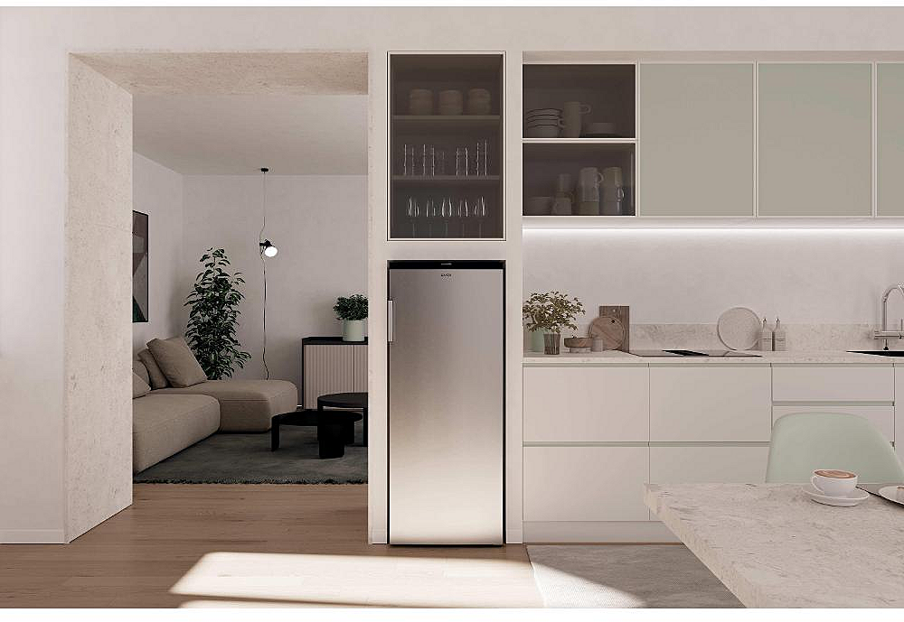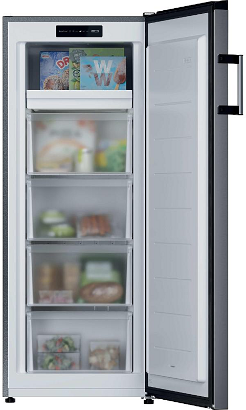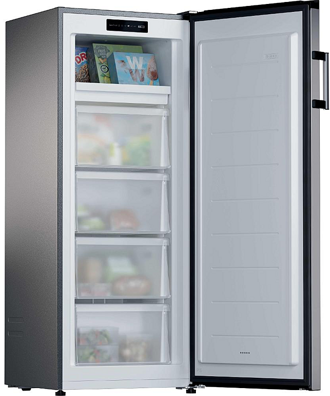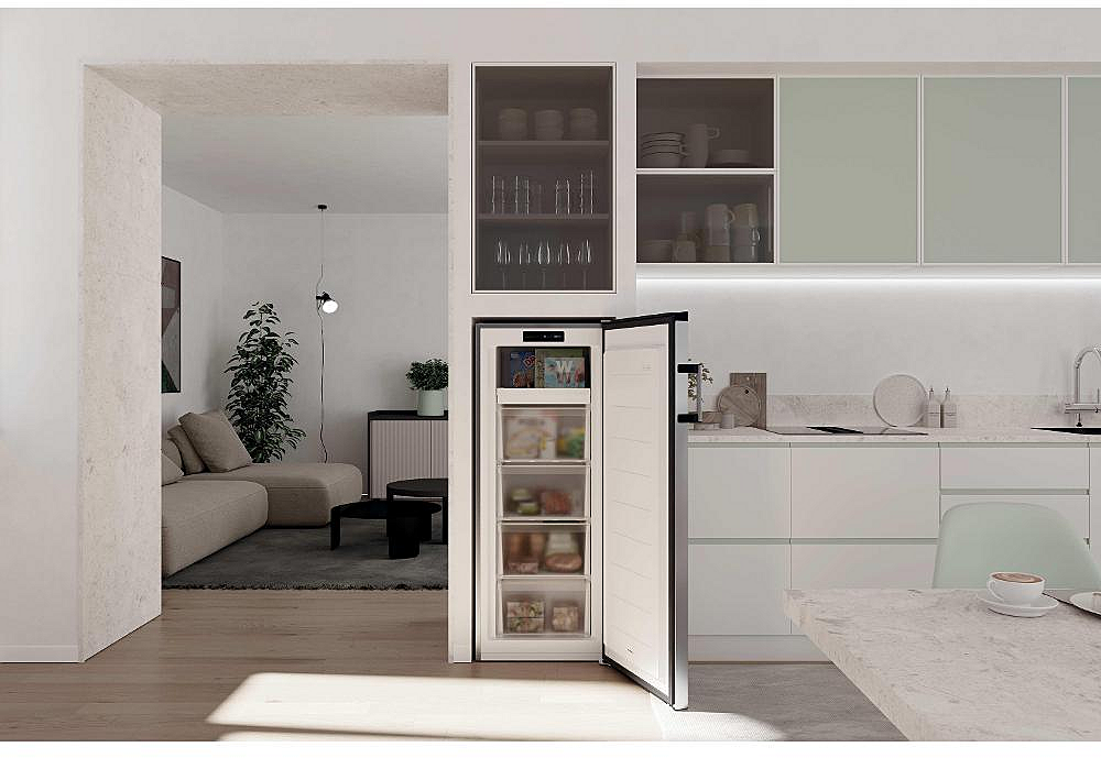 Šuplíkový mrazák Candy s technologií Low Frost pro menší tvorbu námrazy, možností změny směru otevírání a mechanickým ovládáním. Celkový objem 169 l, 4 průhledné zásuvky a jedna výsuvná police.