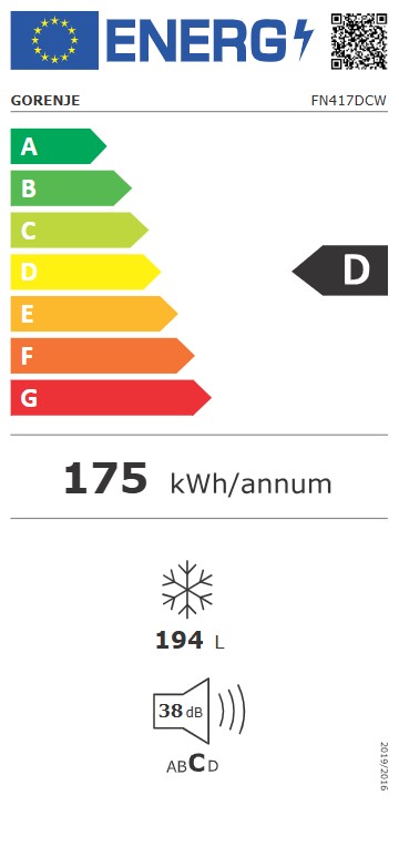 Beznámrazový skříňový mrazák Gorenje s invertorovým kompresorem, elektronickým ovládáním a zvukovým alarmem otevřených dveří. Objem 194 l a energetická třída D.