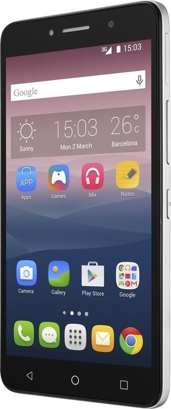 Smartphone Alcatel s displejem o úhlopříčce 5 palců s vnitřní pamětí 8 GB. podporou Dual SIM, fotoaparátem s rozlišením 8 megapixelů a operačním systémem Android.