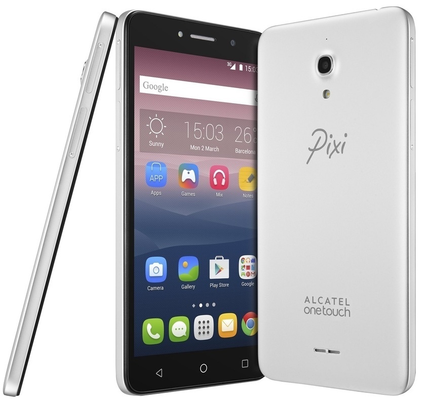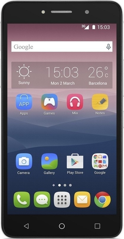 Smartphone Alcatel s displejem o uhlopříčce 6 palců s vnitřní pamětí 8 GB, zadním fotoaparátem s rozlišením 8 megapixelů a operačním systémem Android.