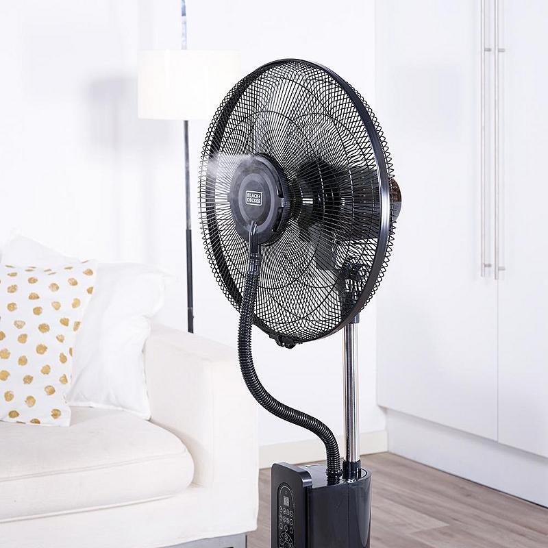Stojanový ventilátor Black+Decker s funkcí oscilace, časovačem, automatickým vypnutím a vyjímatelnou 2litrovou nádržkou na vodu.