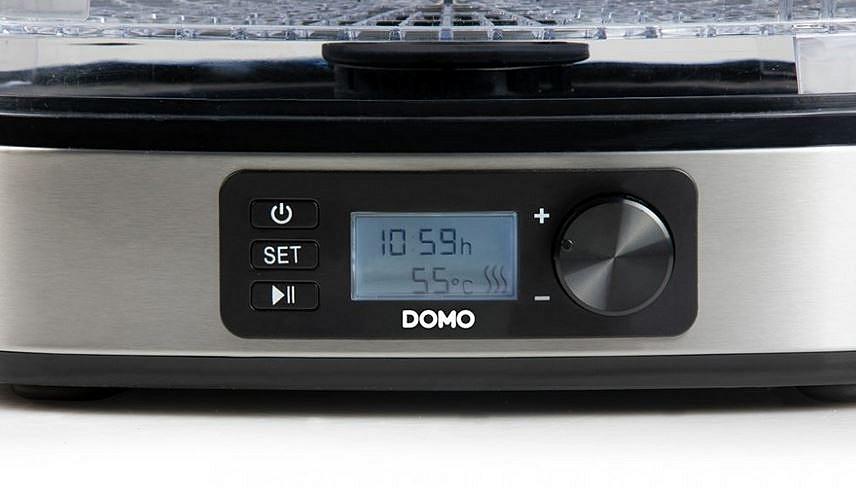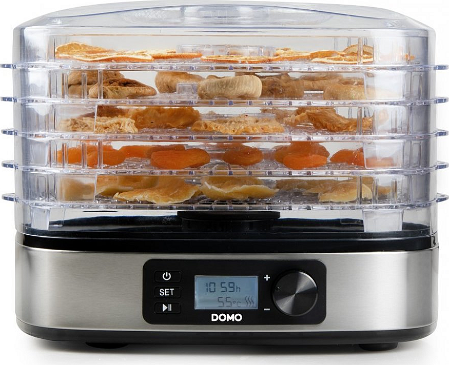 Kompaktní sušička ovoce Domo s 5 sušícími patry, nastavitelnou dobou sušení a regulací teploty.