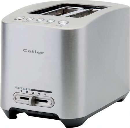 Toaster Catler je vyroben ze slitiny ušlechtilých kovů. S elektronickým ovladačem nastavíte intenzitu opečení v rozsahu 1 až 5. LED ukazatel zobrazí nastavený stupeň opečení a po spuštění zahájí odpočítávání doby opékání.