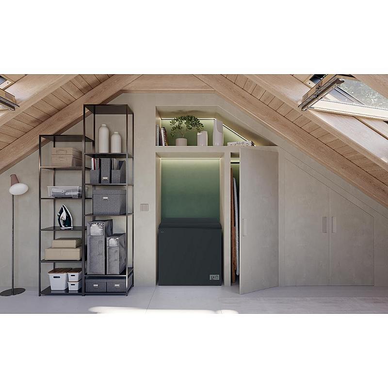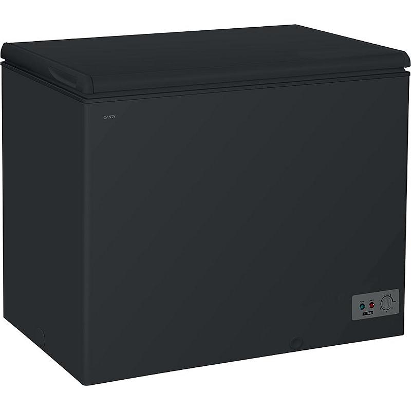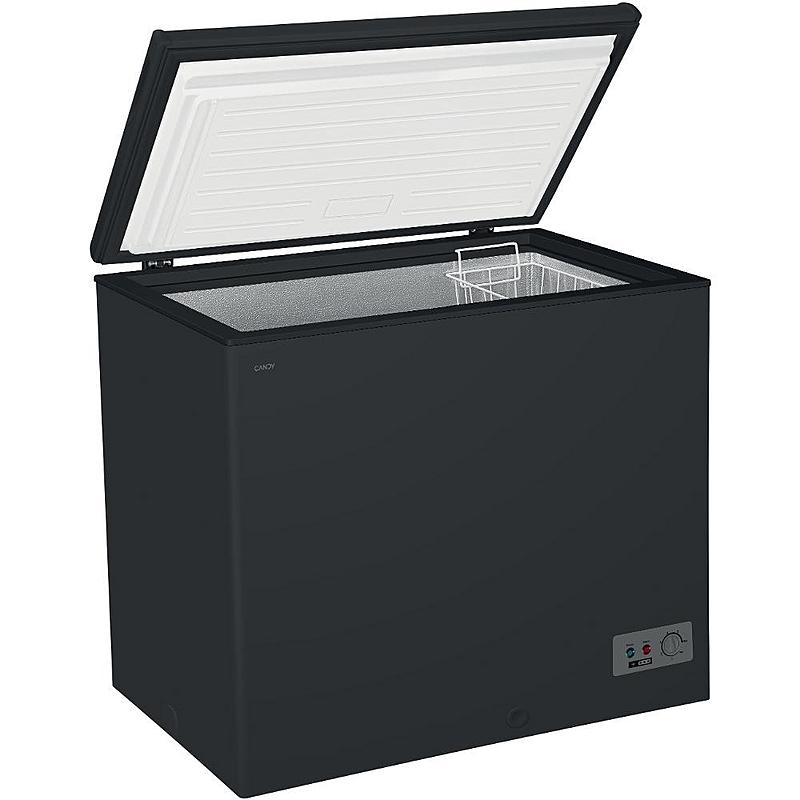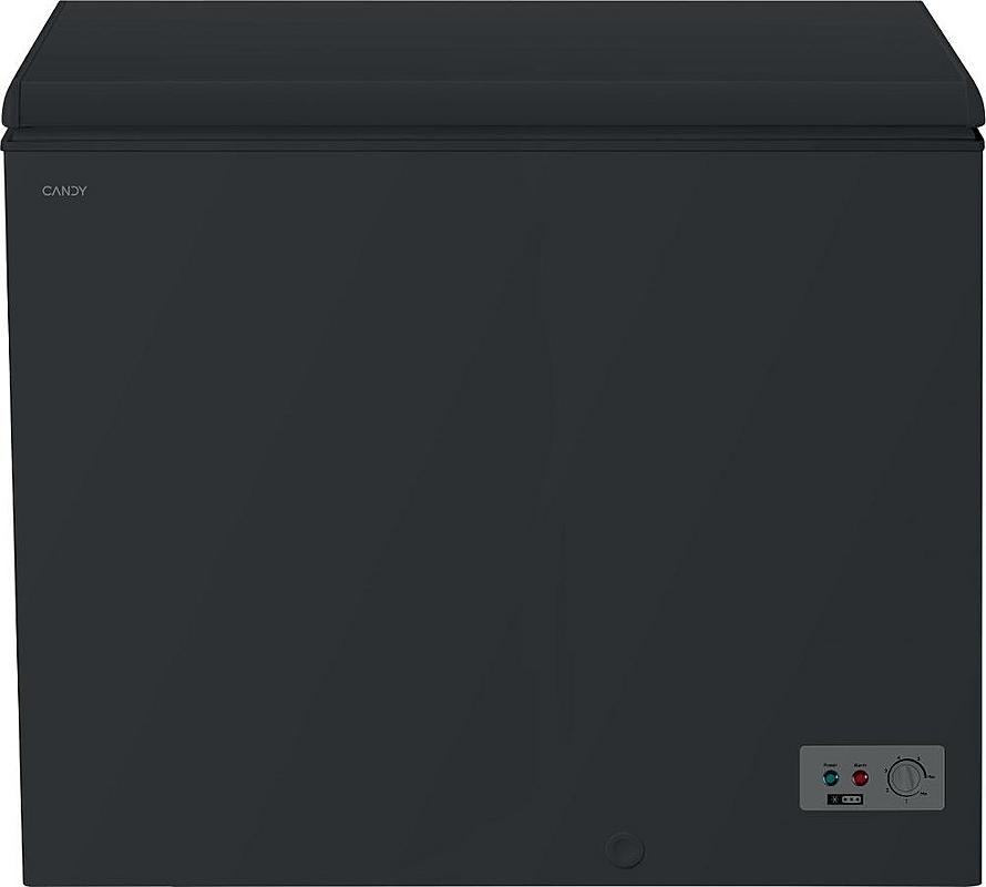 Pultový mrazák Candy s mechanickým ovládáním, kontrolkou provozu a otočným termostatem. Objem 196 l a 1 drátěný koš.