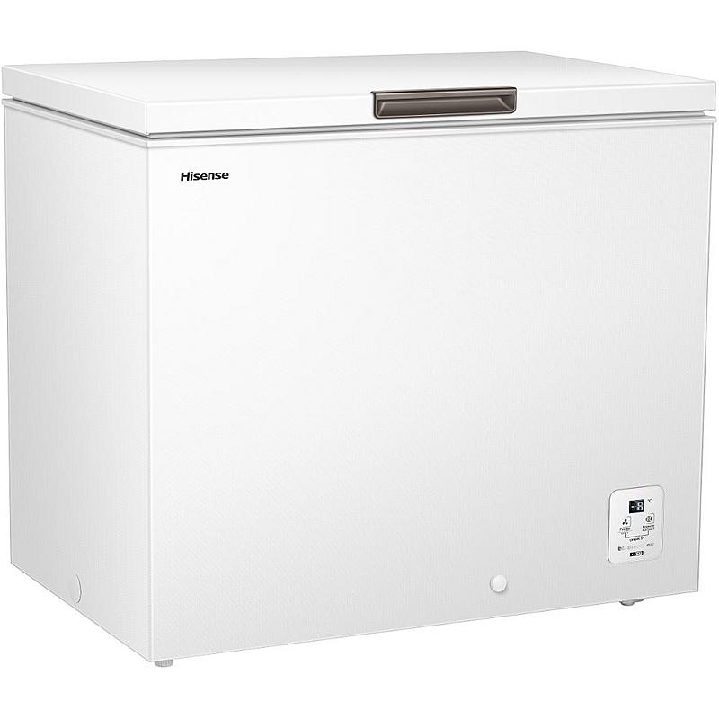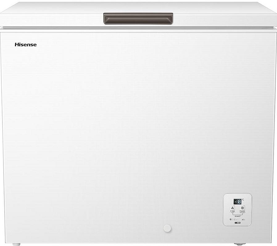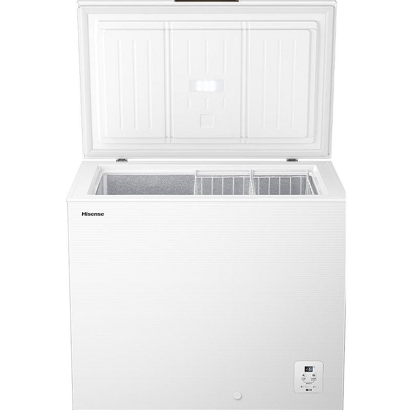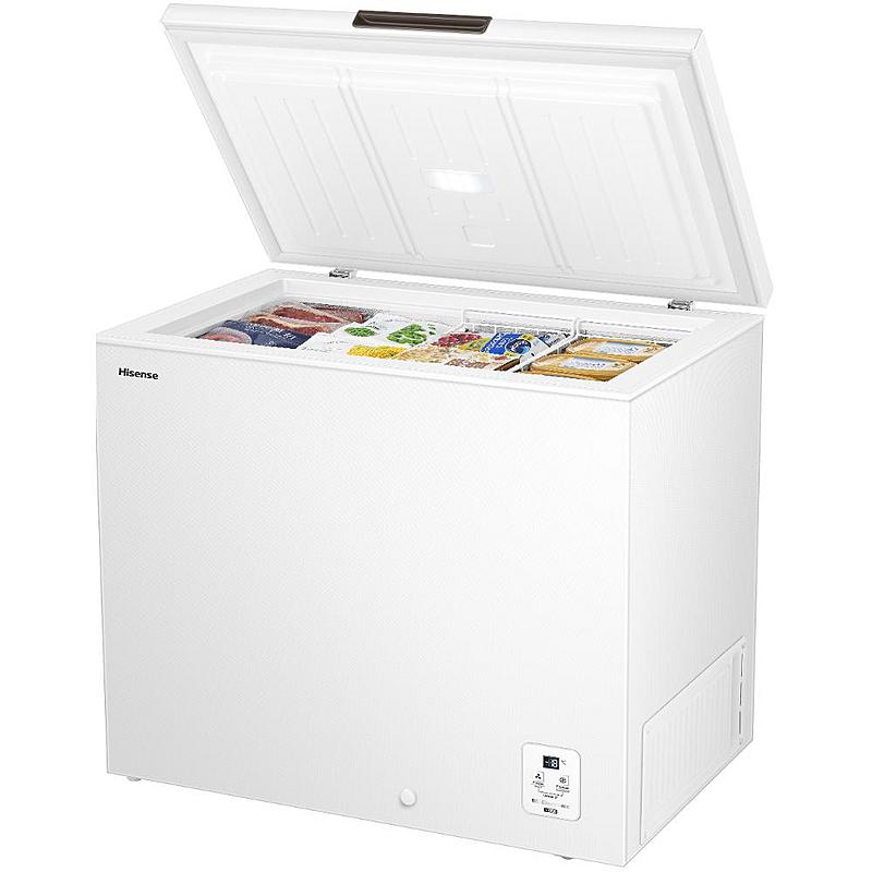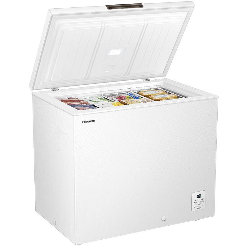 Pultový mrazák Hisense s funkcí rychlého mrazení, LED displejem a LED osvětlením. Energetická třída A a objem 217 l.