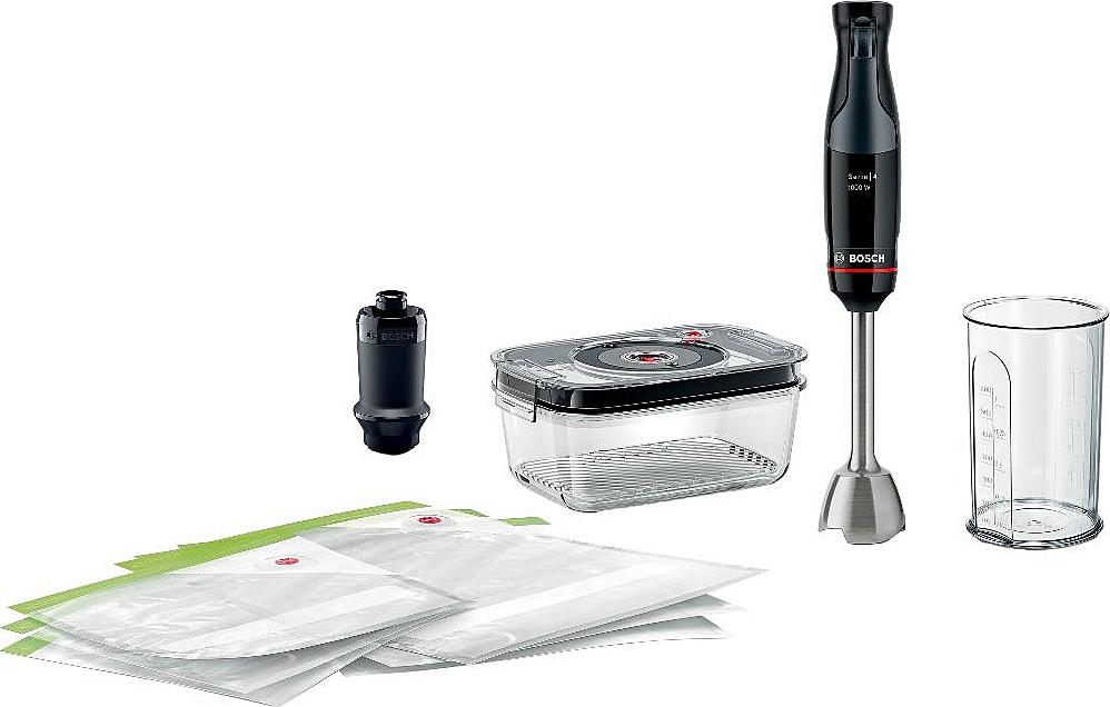 Tyčový mixér Bosch s objemem nádoby 0,6 litrů, nerezovou nohou a příkonem 1000 W.
