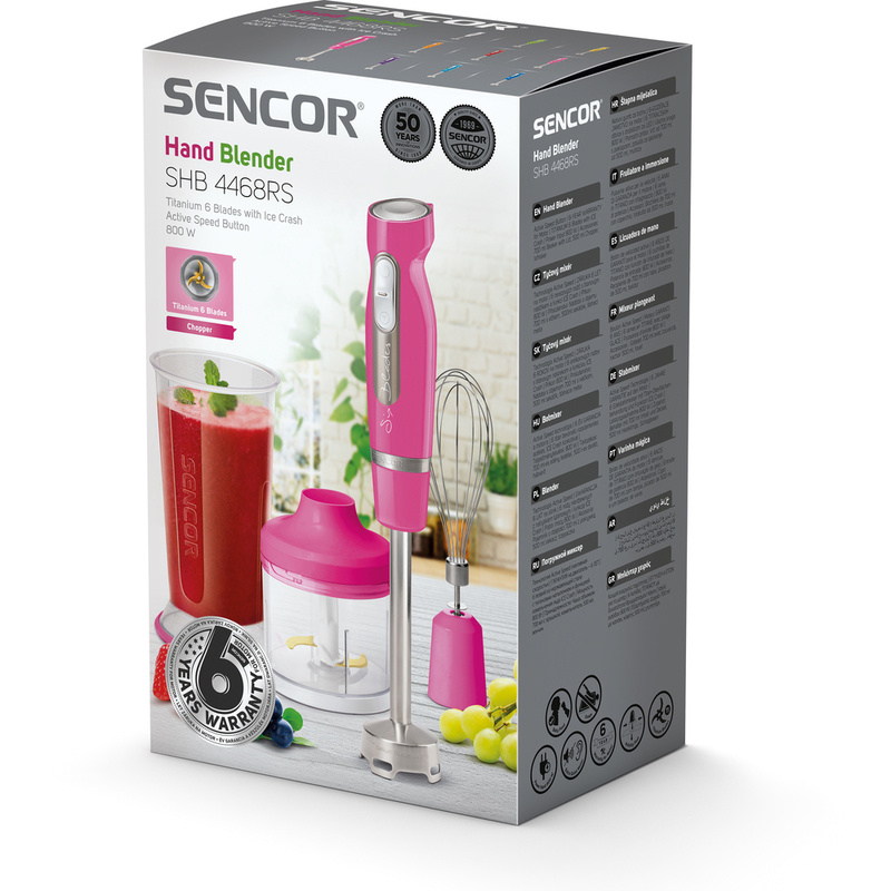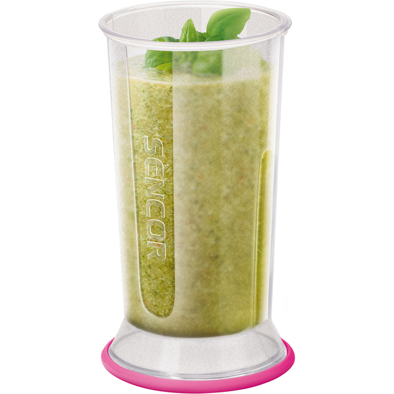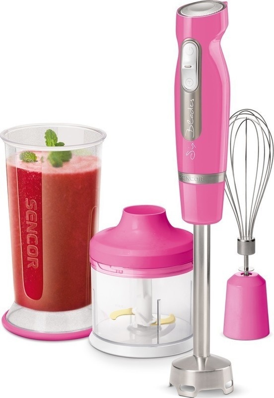 Tyčový mixér Sencor s příslušenstvím pro mixování, šlehání a sekání. Mixovací nádoba o velikosti 700 ml, sekáček s nerezovými noži.