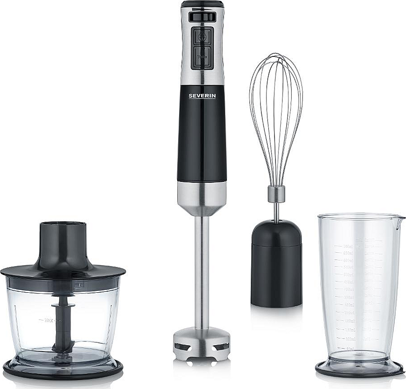 Tyčový mixér Severin s nastavením rychlosti, pulsním spínačem a pracovní nádobou.