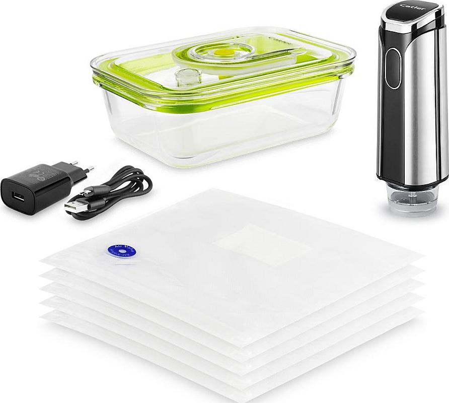 Vakuovací sada Catler s LED indikátory provozu v balení s vakuovacími sáčky.