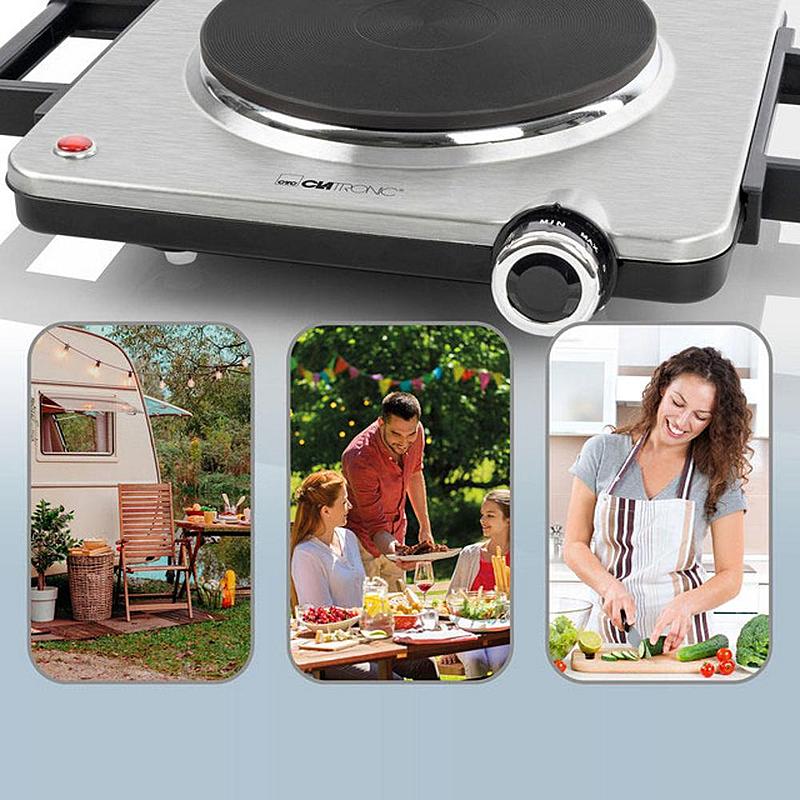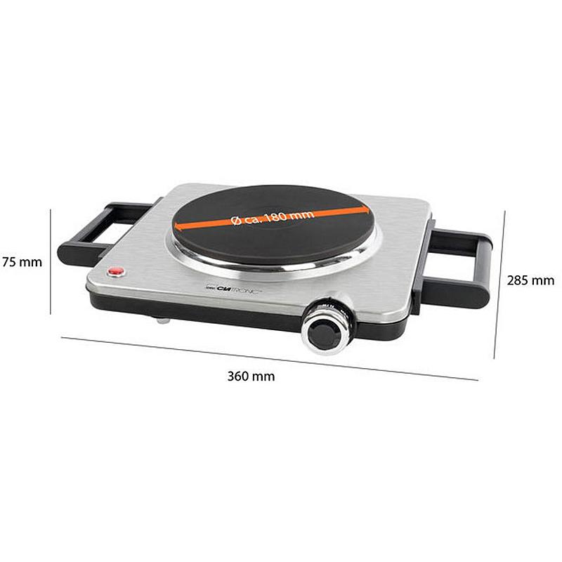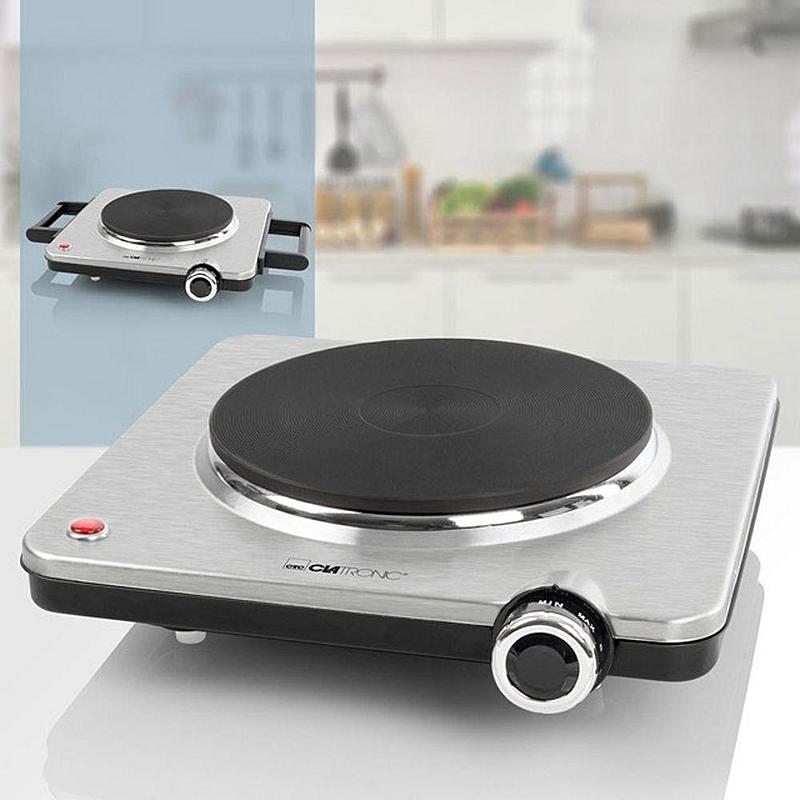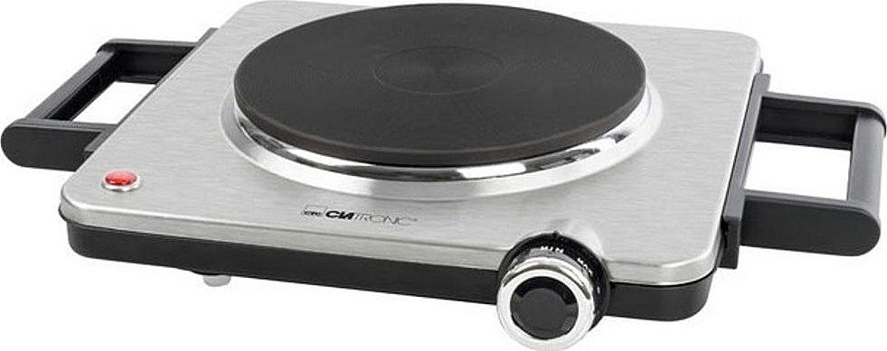 Elektrický vařič Clatronic s nastavitelným termostatem a kontrolkou provozu.