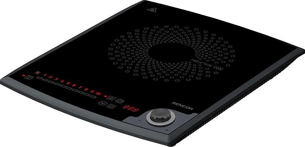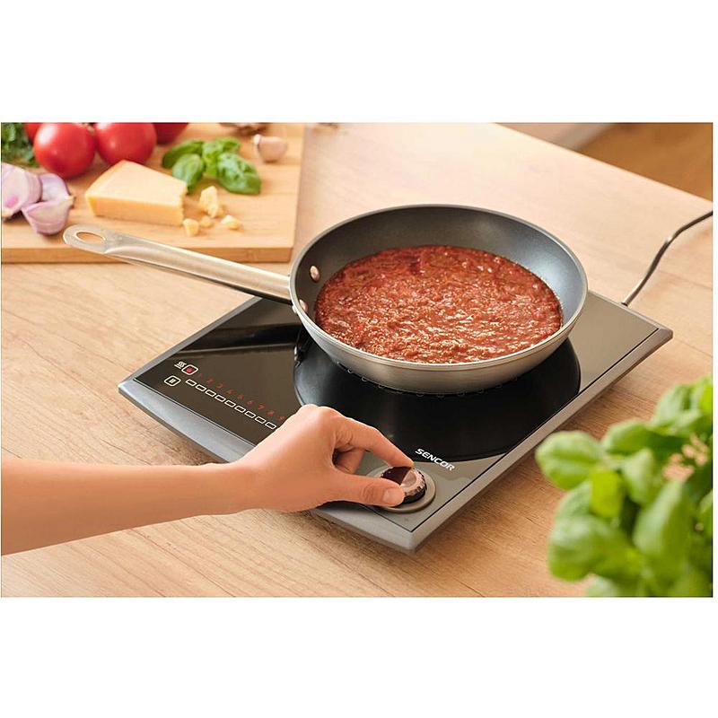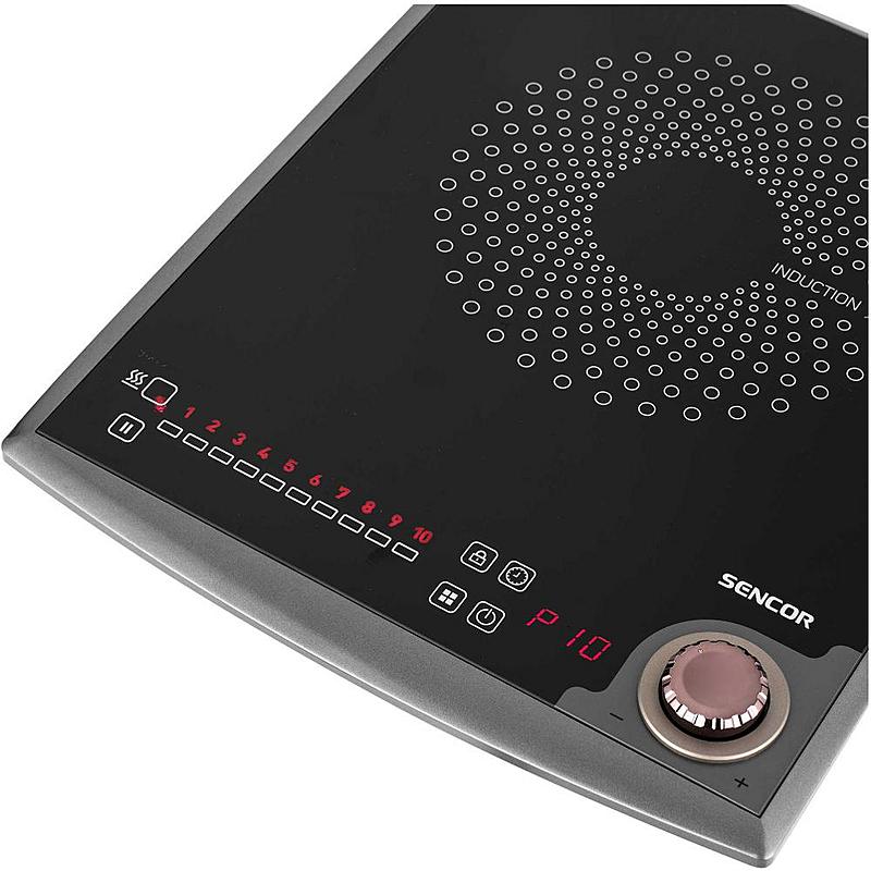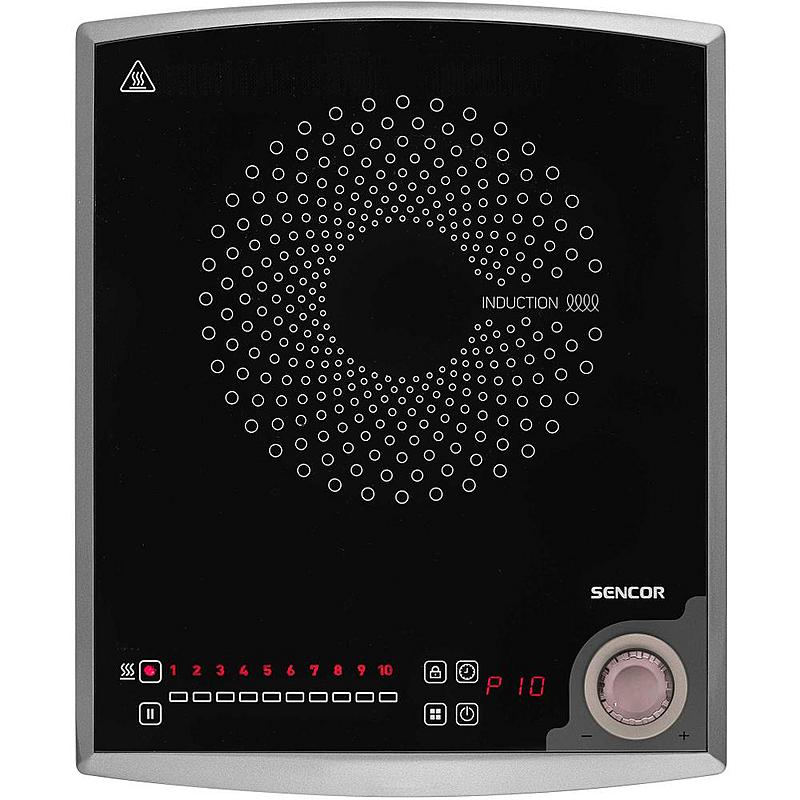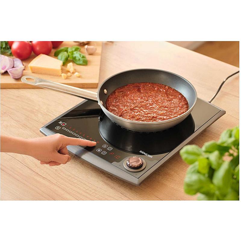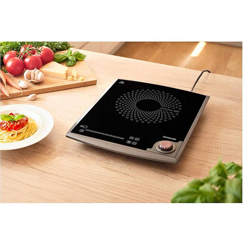 Indukční vařič Sencor s intuitivním ovládáním dotykem a otočným ovladačem. Časovač, 10 možností nastavení teploty a výkon 2000 W.