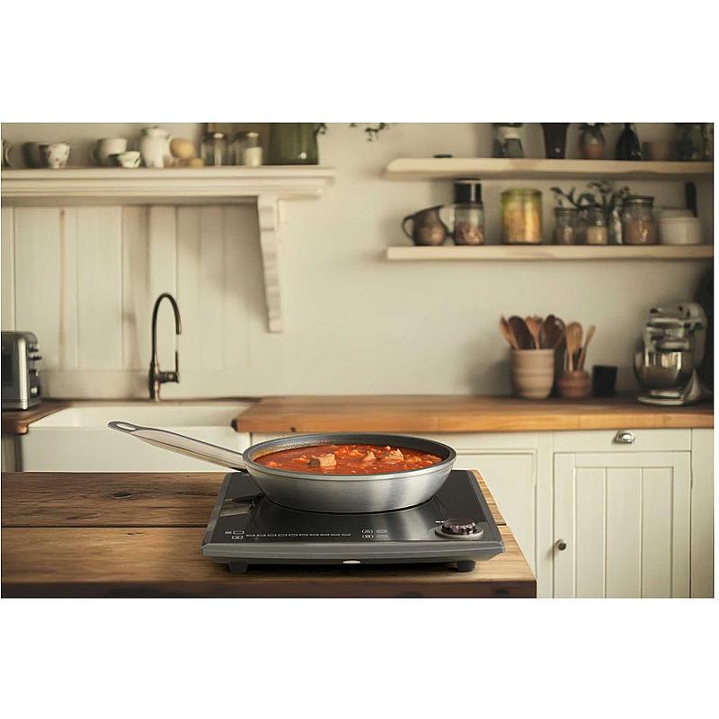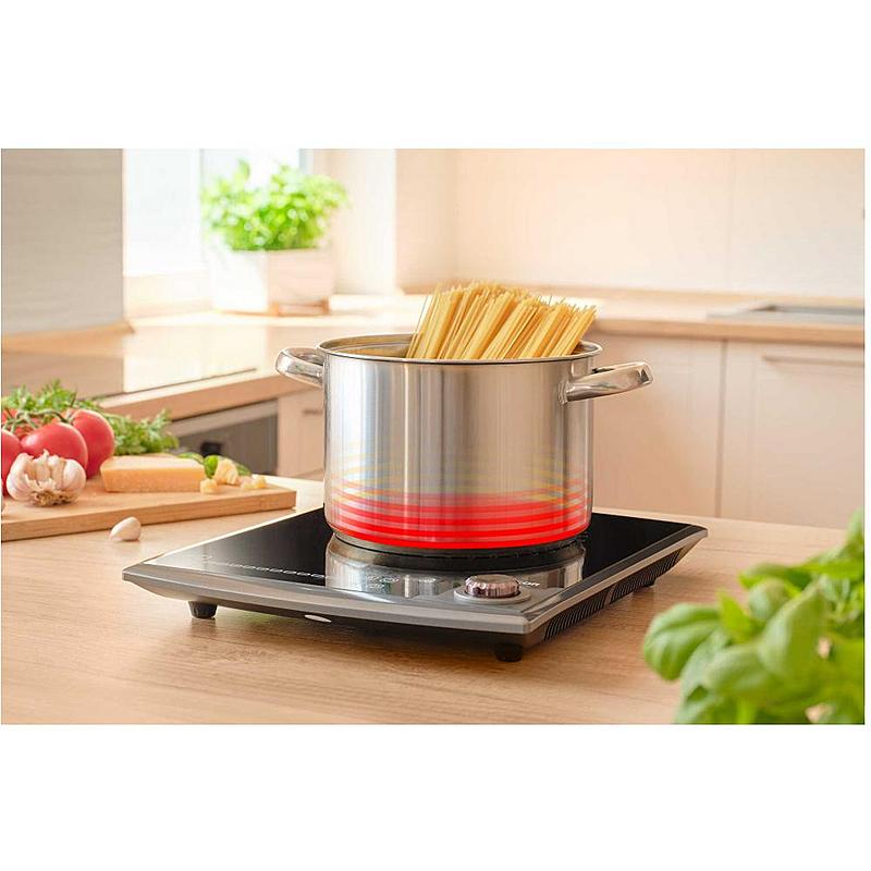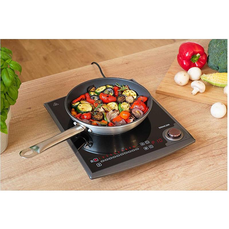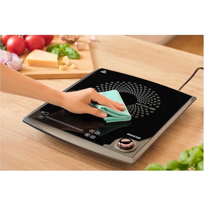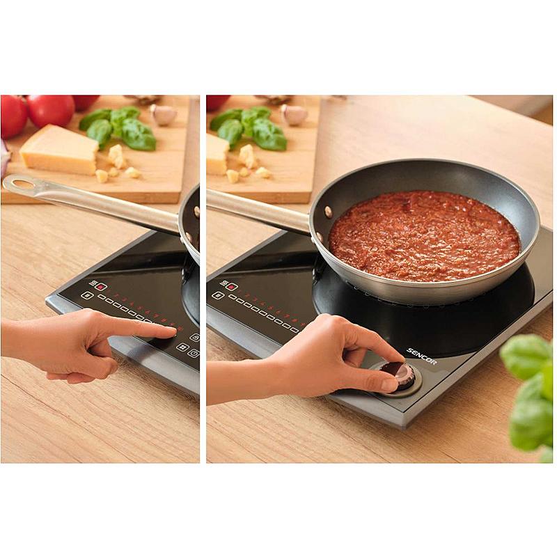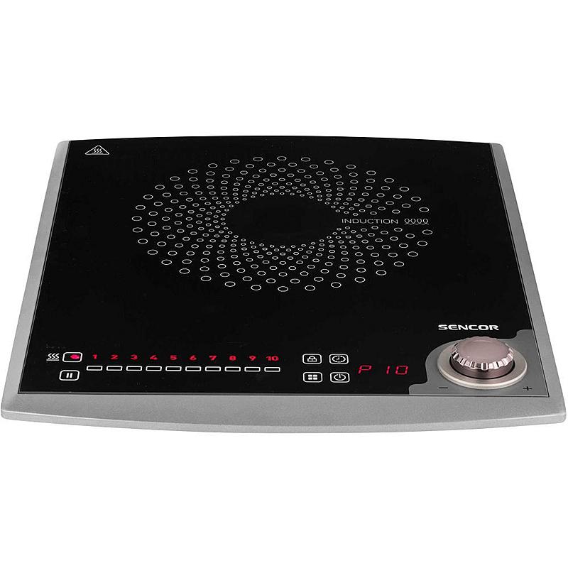 Indukční vařič Sencor s intuitivním ovládáním dotykem a otočným ovladačem. Časovač, 10 možností nastavení teploty a výkon 2000 W.