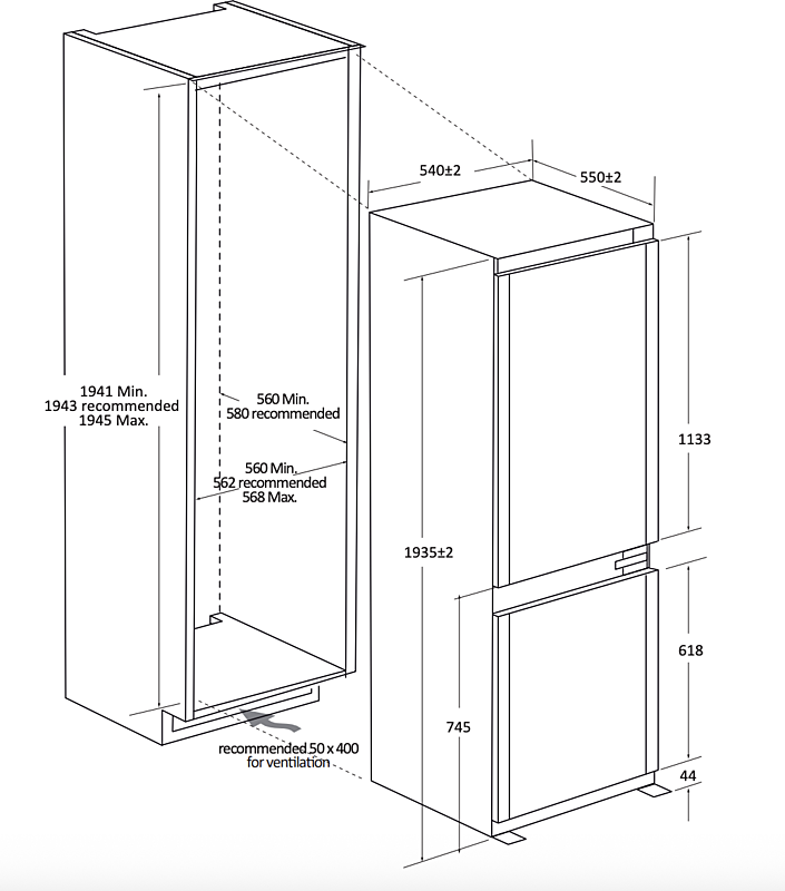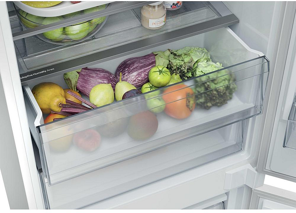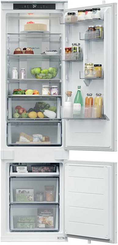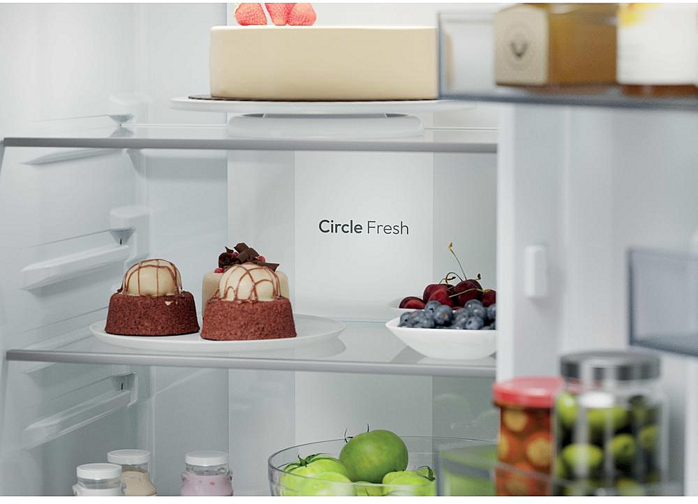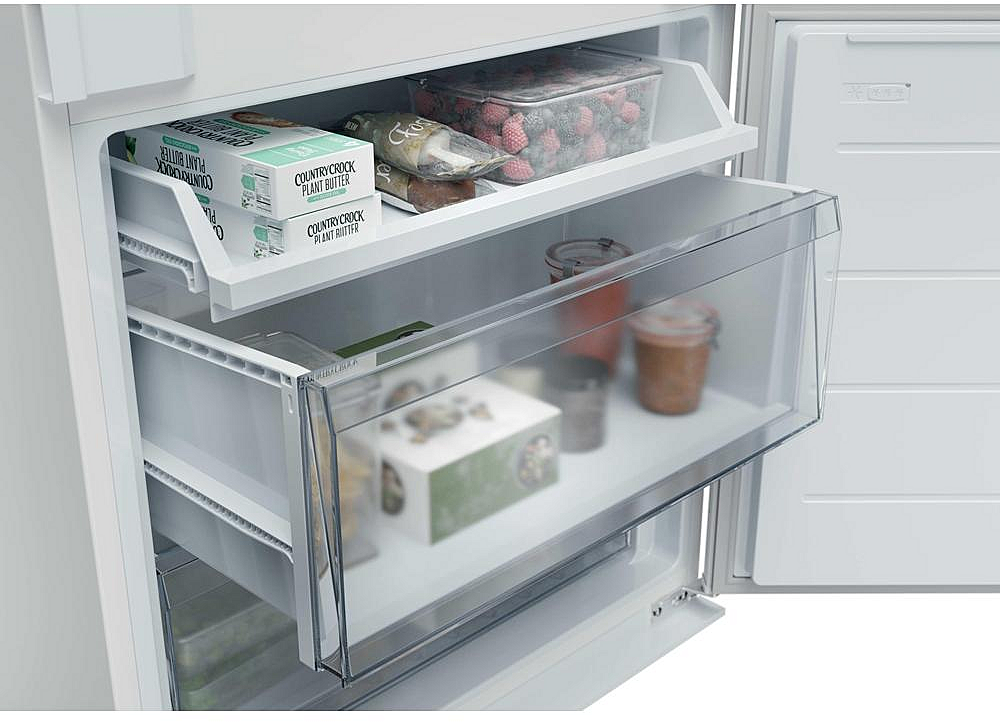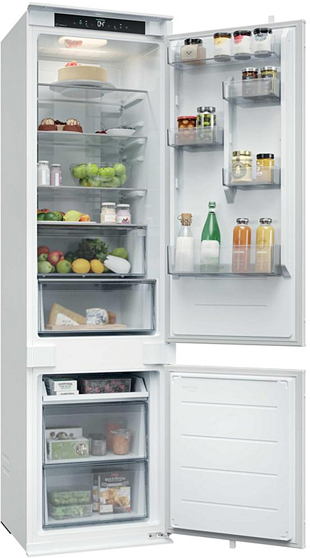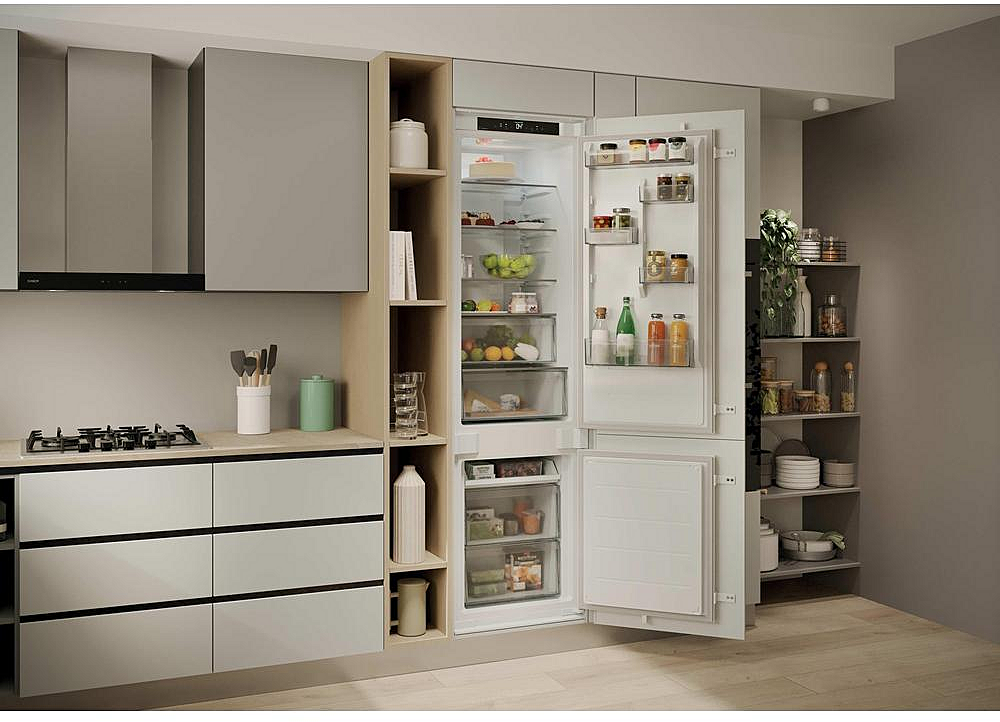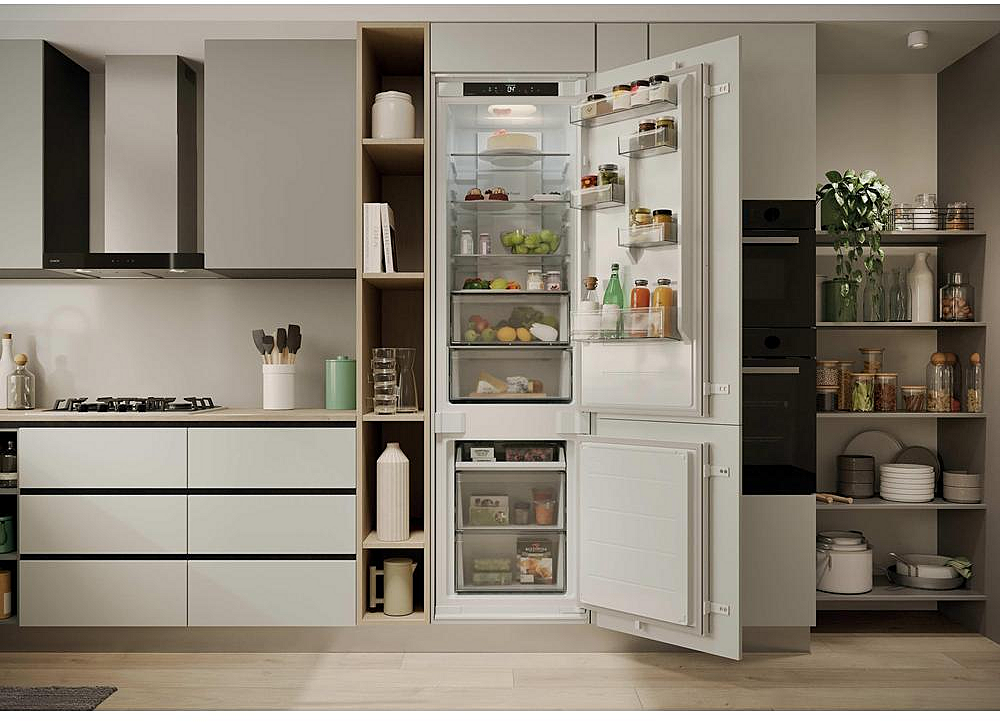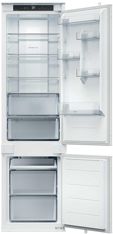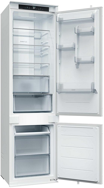 Vestavná beznámrazová chladnička Candy se zaměnitelným otvíráním. Energetická třída E, mrazící výkon 6 kilogramů za den a celková kapacita 284 litrů.
