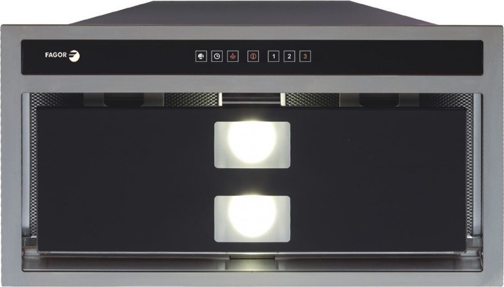 Vestavný odsavač par Fagor s dotykovým ovládáním, 5 stupni výkonu, LED osvětlením a výkonem odsávání až 710 m3 za hodinu.
