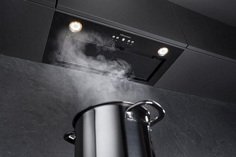 Vestavný odsavač par Hisense s časovačem, 4 rychlostmi a výkonem motoru 260 W.