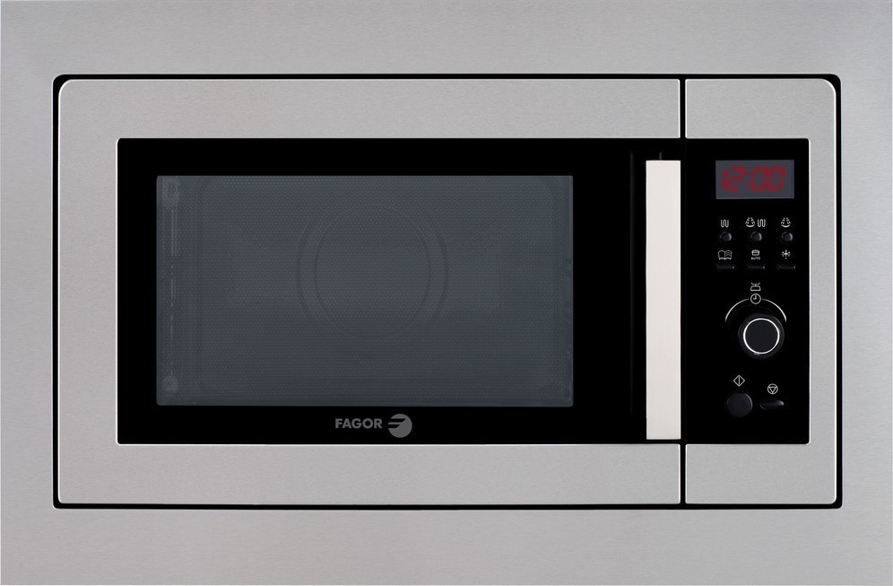 Vestavná mikrovlnná trouba Fagor o objemu 17 litrů s pěti úrovněmi výkonu, časovačem vypnutí a displejem.