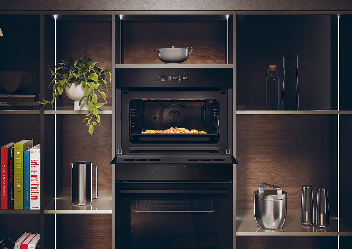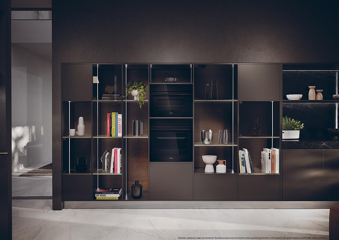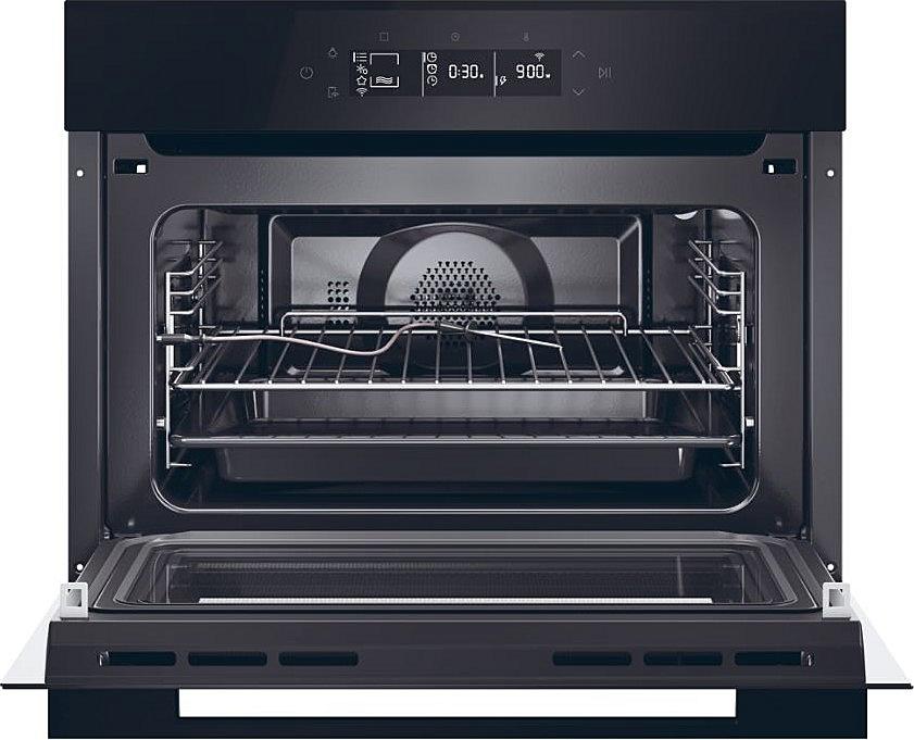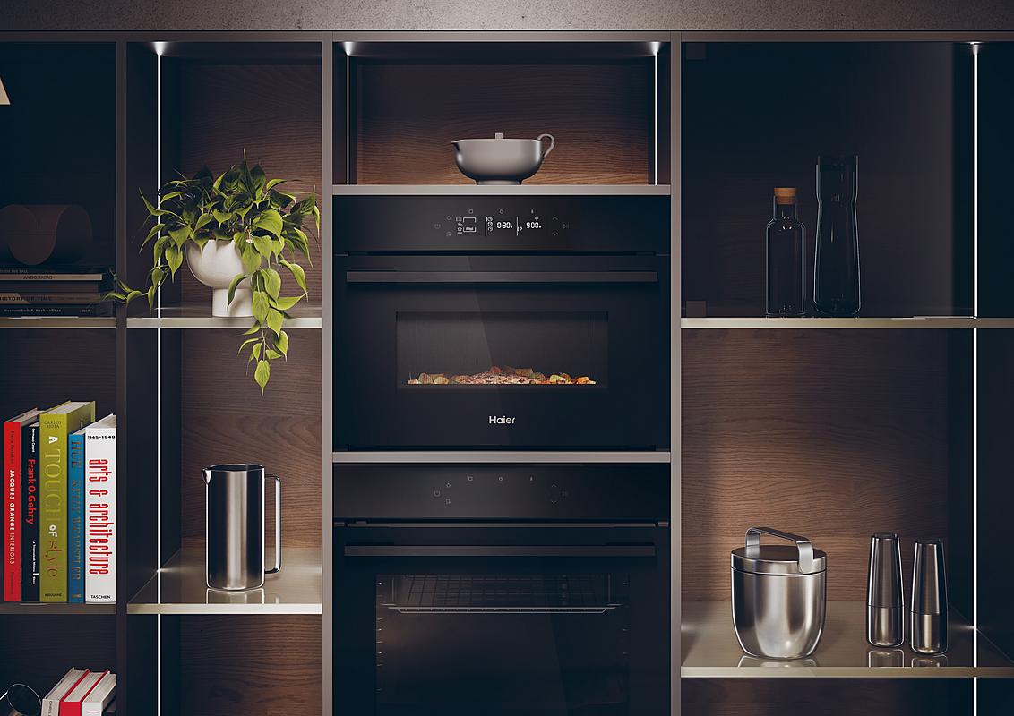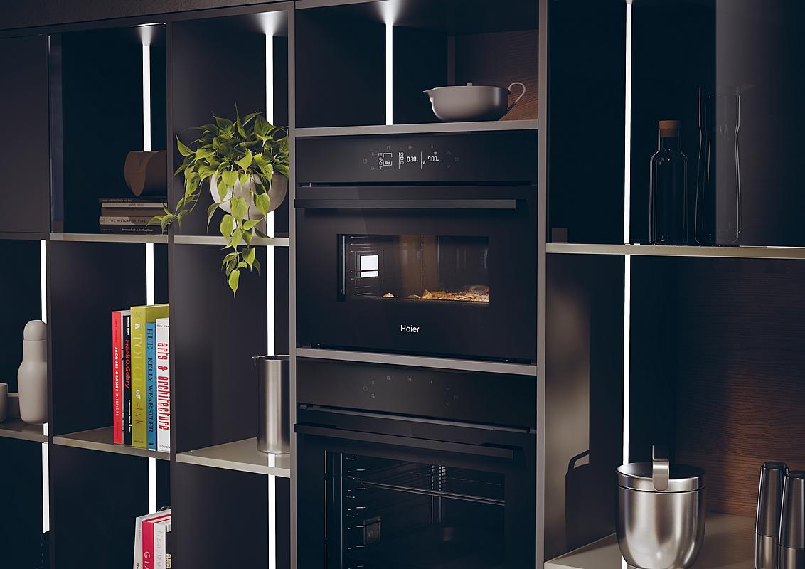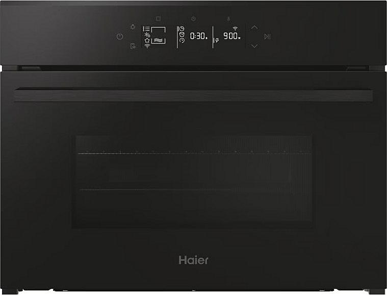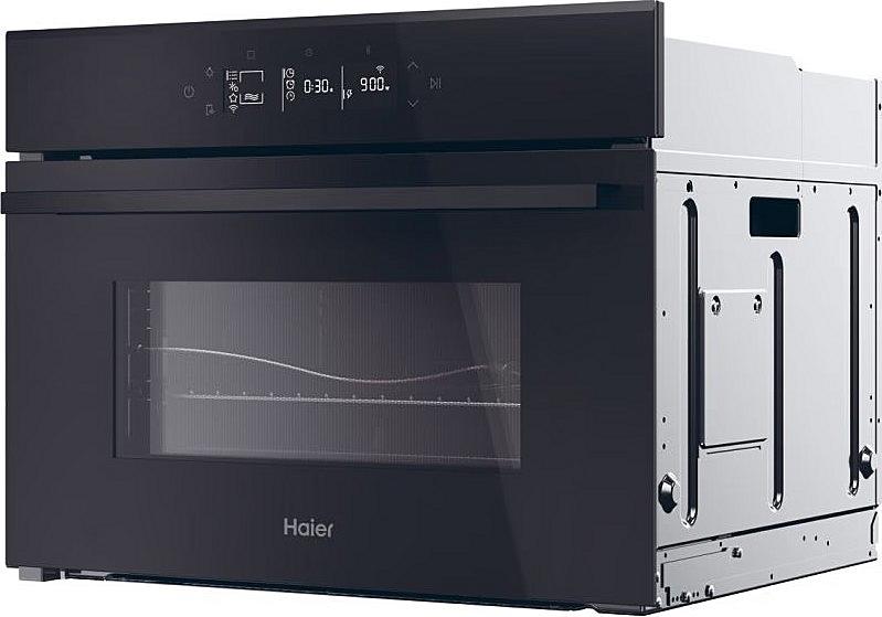 Kompaktní mikrovlnná trouba Haier s grilem a horkým vzduchem. Elektronická minutka, technologie inverter, odložený start a 12 programů.