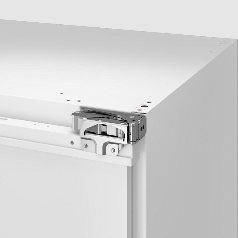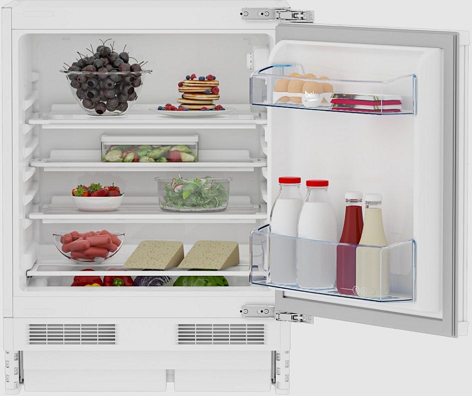 Vestavná monoklimatická chladnička Beko se zaměnitelným otvíráním. Energetická třída E a celková kapacita 130 litrů.
