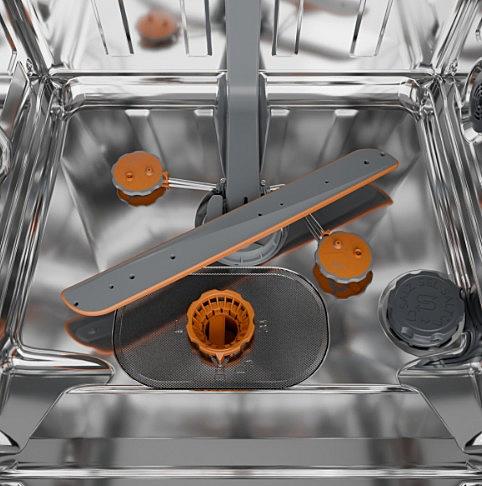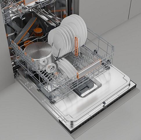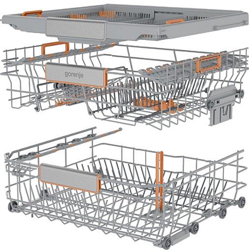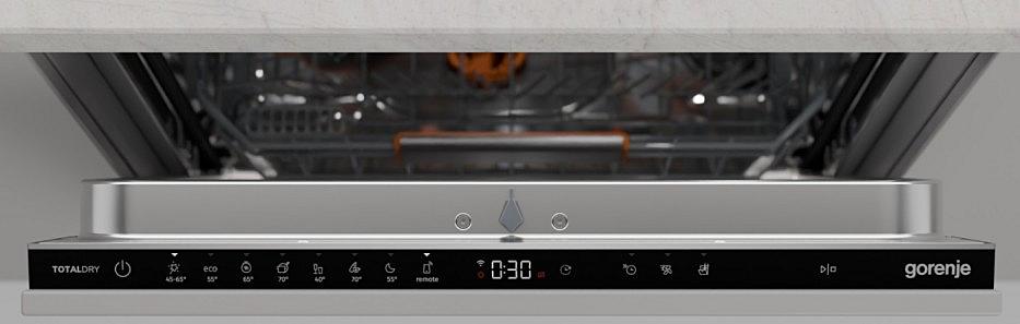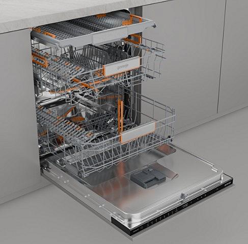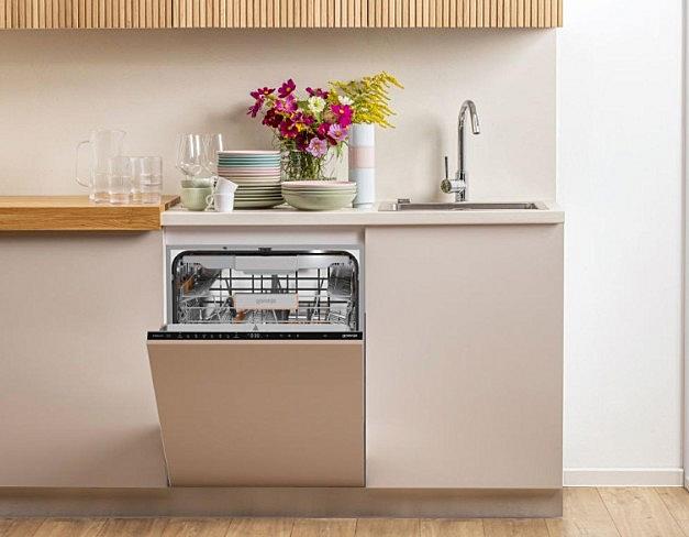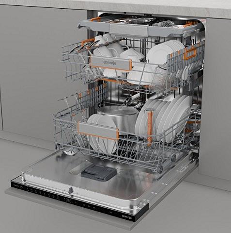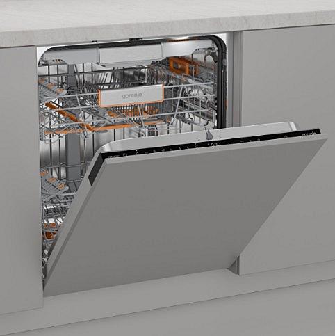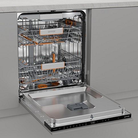 Plně integrovaná myčka Gorenje s automatickým otevíráním dveří, AquaStopem a vnitřním osvětlením. Energetická třída B a kapacita 16 sad nádobí.