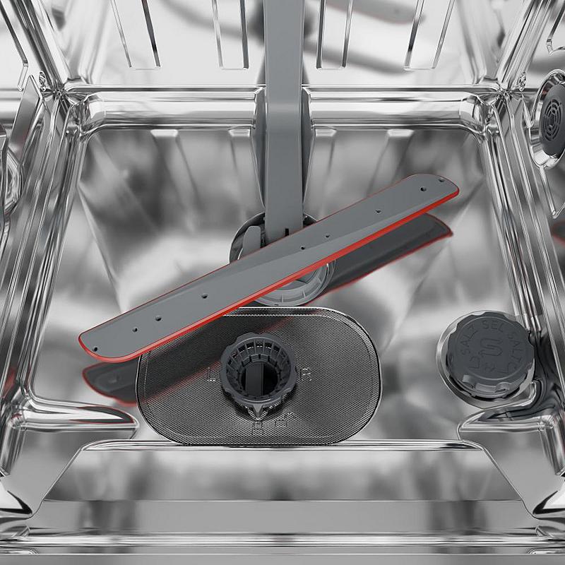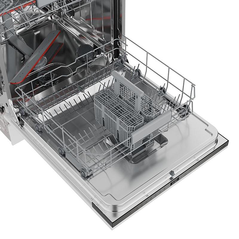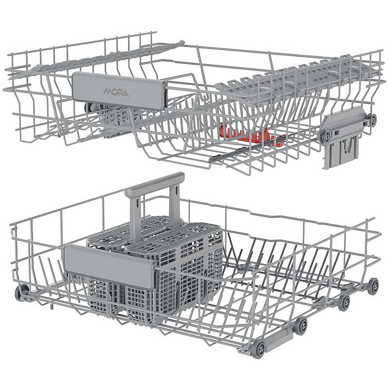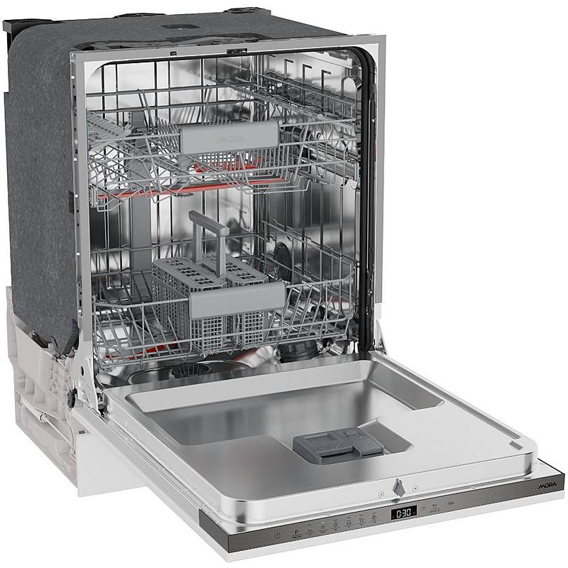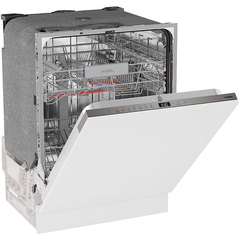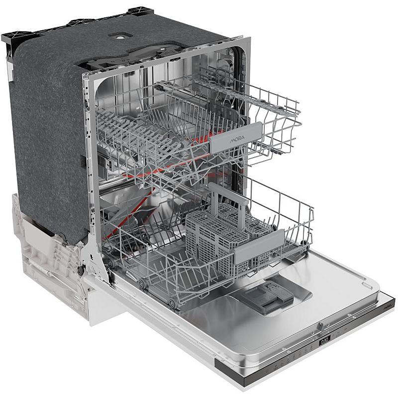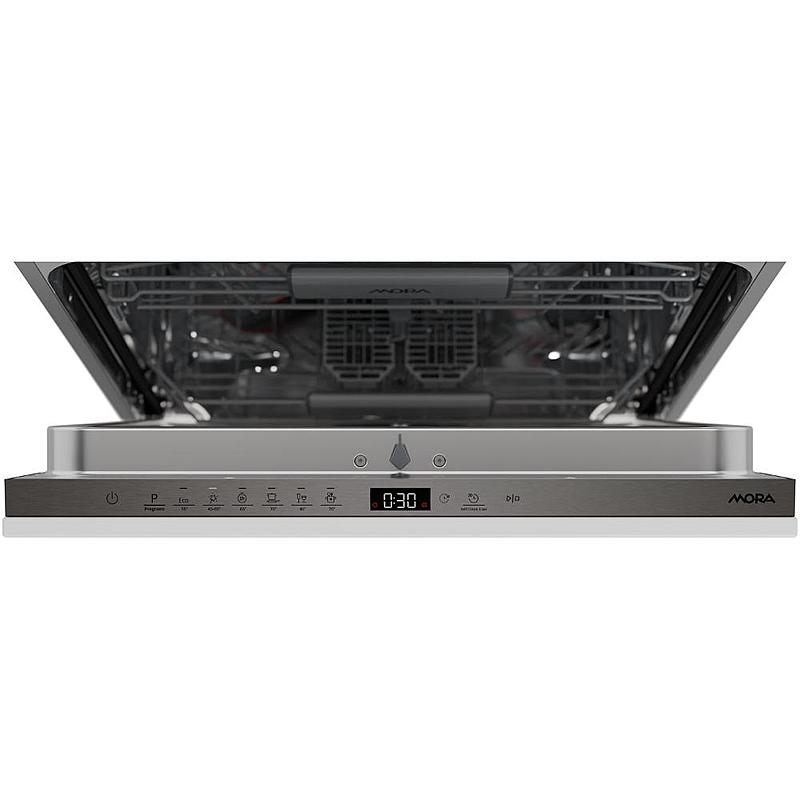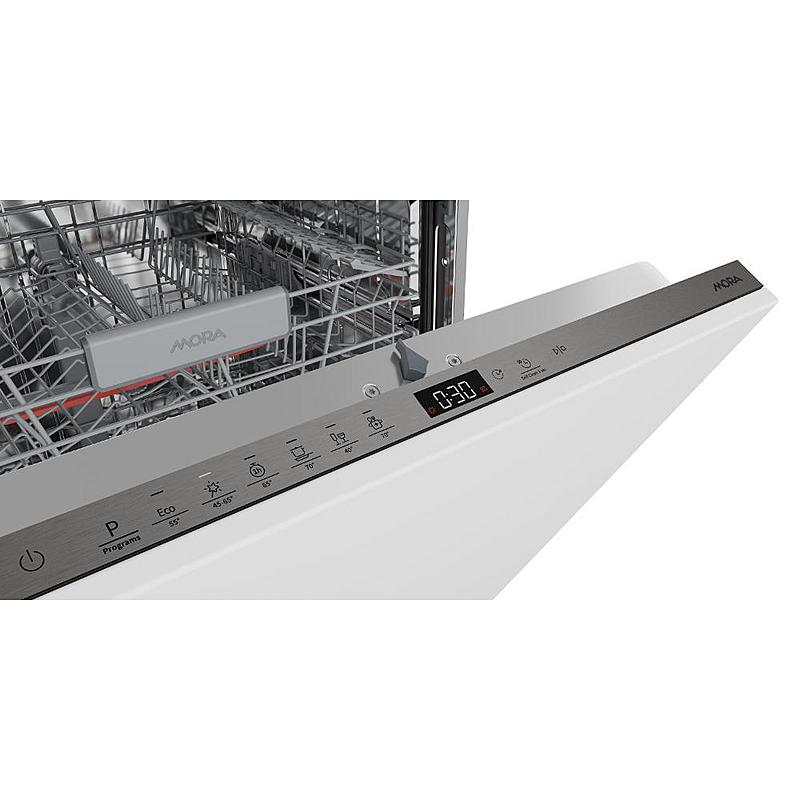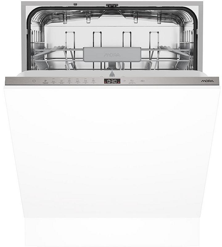 Plně vestavná myčka Mora s pootevřením dvířek na konci programu, Auto programem a Aqua stopem. Energetická třída D, kapacita 14 sad nádobí a odložený start.