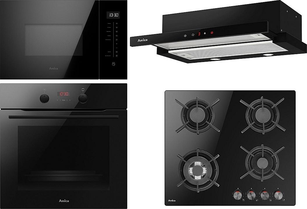 Vestavný set Amica v sadě s multifunkční a mikrovlnnou troubou, plynovou varnou deskou a teleskopickým odsavačem.