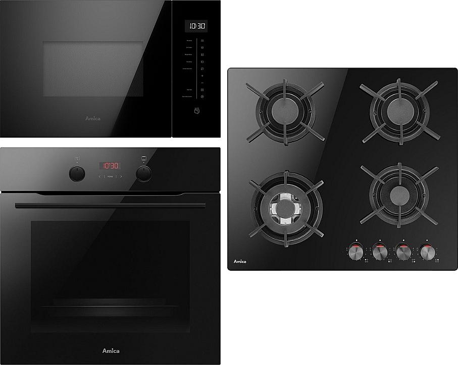 Vestavný set Amica v sadě s multifunkční troubou, plynovou varnou deskou a mikrovlnnou troubou.