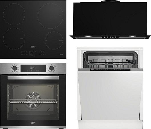 Vestavný set Beko s multifunkční troubou, indukční varnou deskou, vestavným odsavačem a plně integrovanou myčkou.