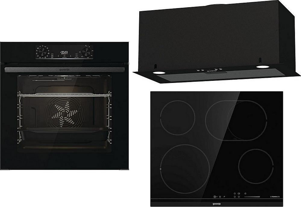 Vestavný set Gorenje v sadě s multifunkční troubou, sklokeramickou varnou deskou a vestavným odsavačem.