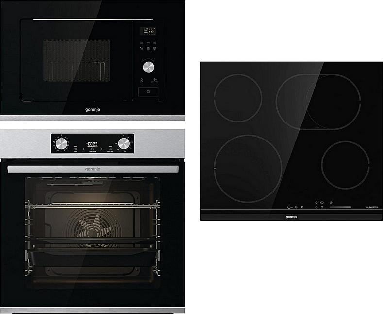 Vestavný set Gorenje v sadě s multifunkční troubou, sklokeramickou varnou deskou a vestavnou mikrovlnnou troubou.