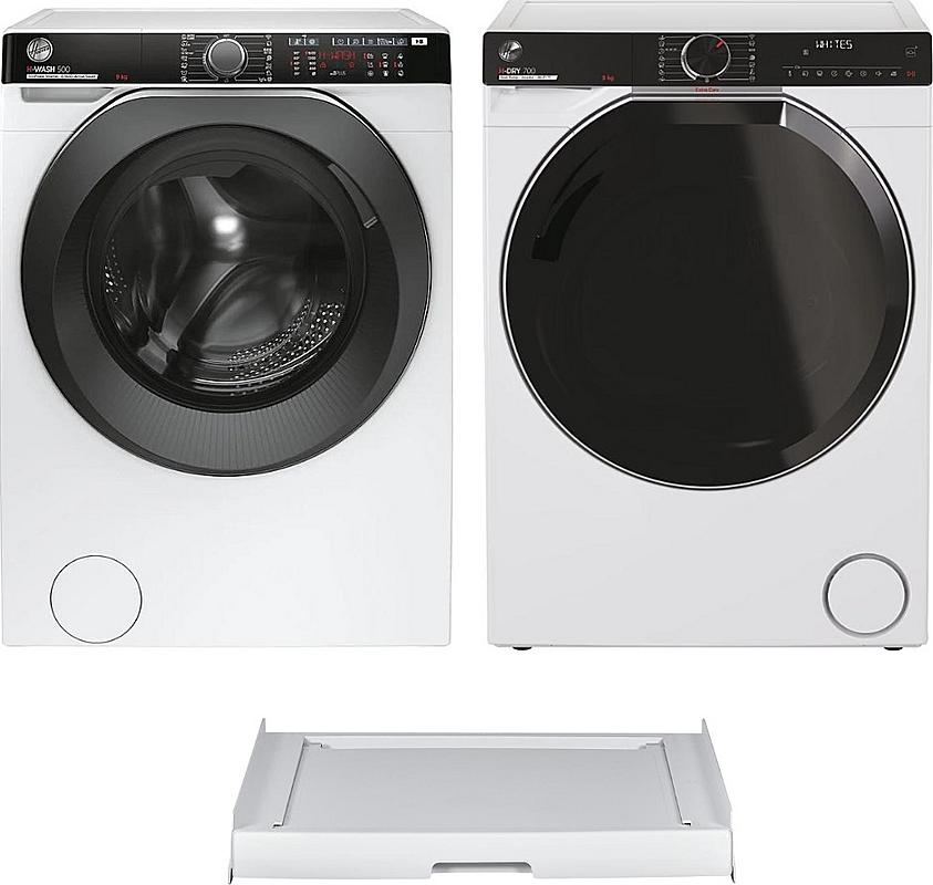 Set pračky, sušičky a mezikusu Hoover na 9 kg prádla. Invertorový motor, tepelné čerpadlo a možnost připojení na odpad.