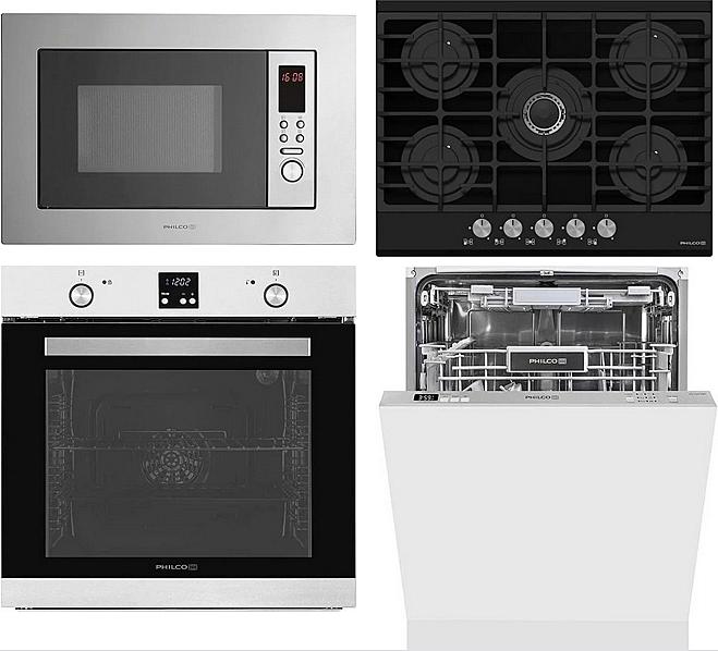 Vestavný set Philco s multifunkční troubou, plynovou varnou deskou, mikrovlnnou troubou a myčkou nádobí.