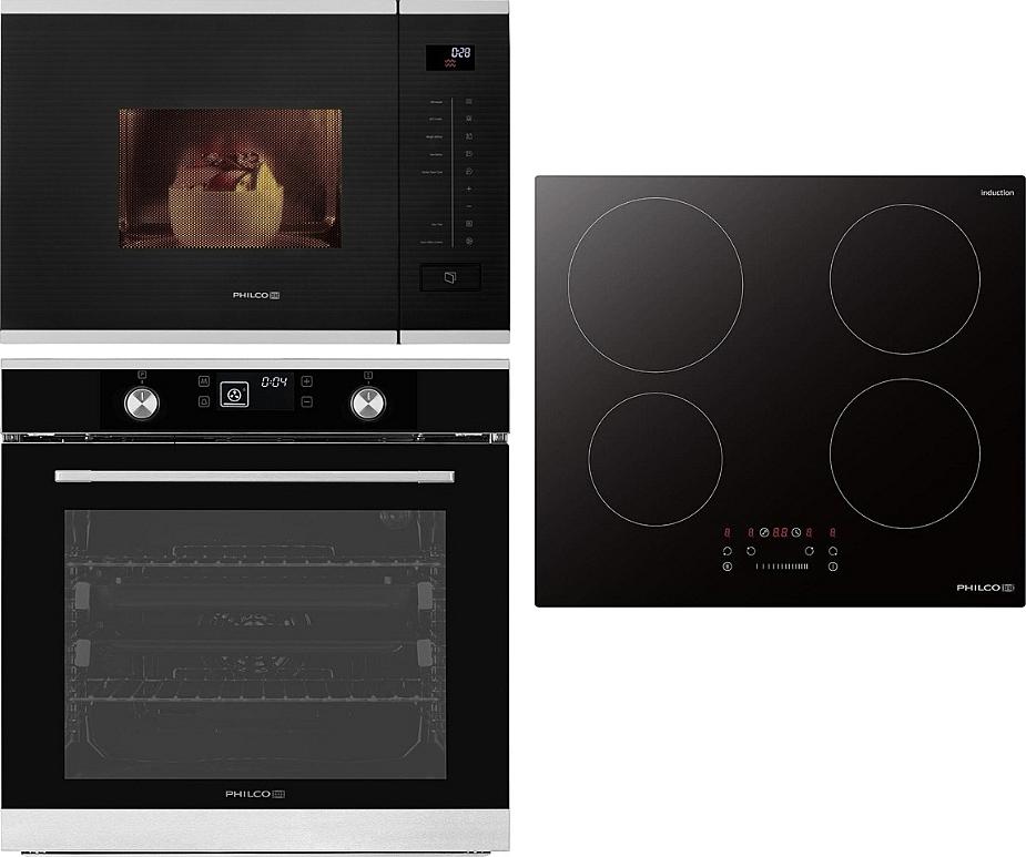 Vestavný set Philco s multifunkční troubou, indukční varnou deskou a mikrovlnnou troubou.