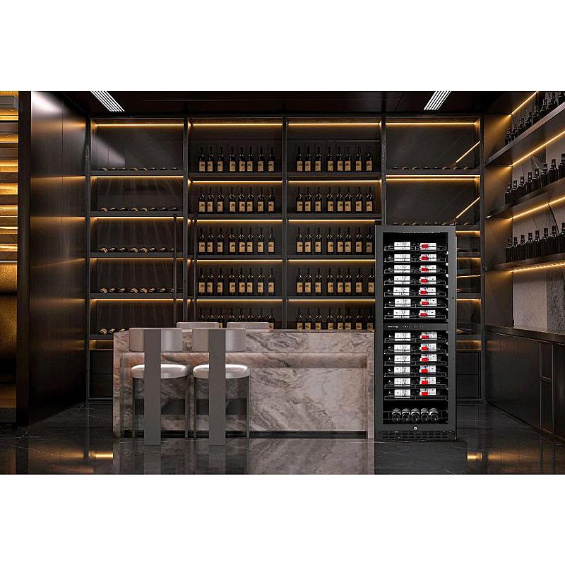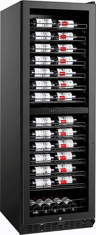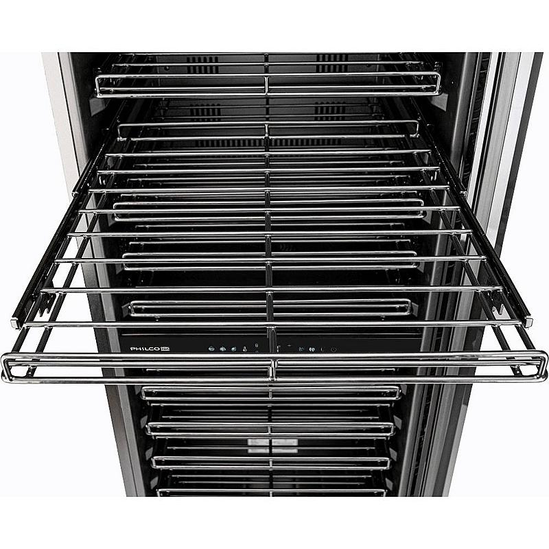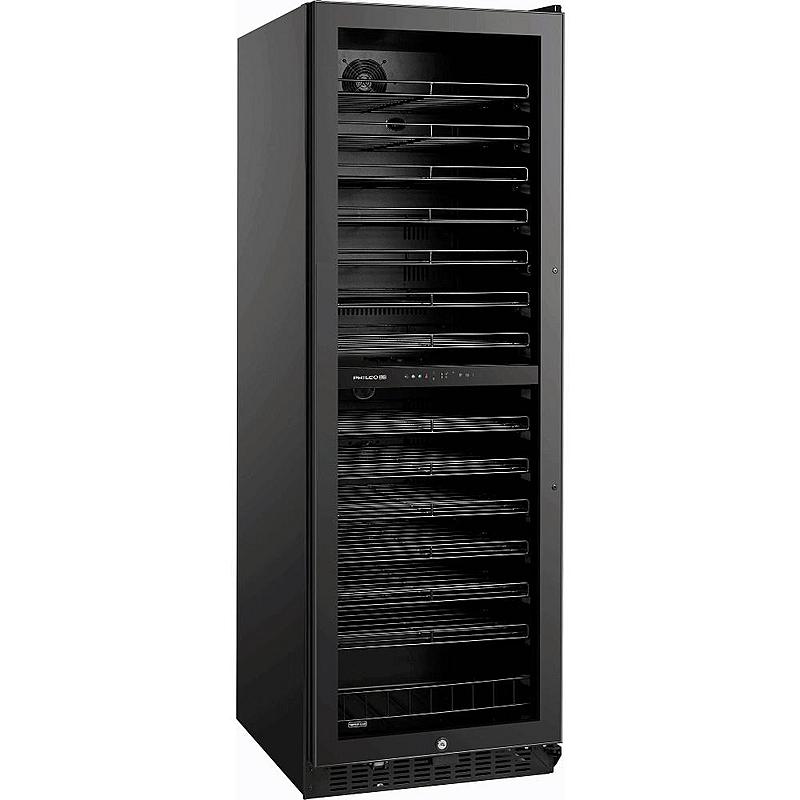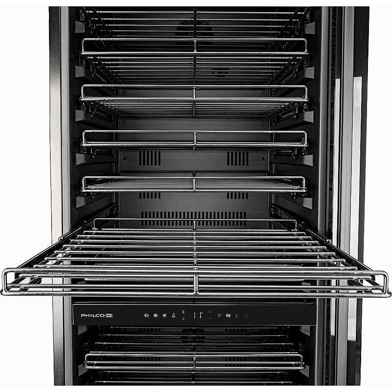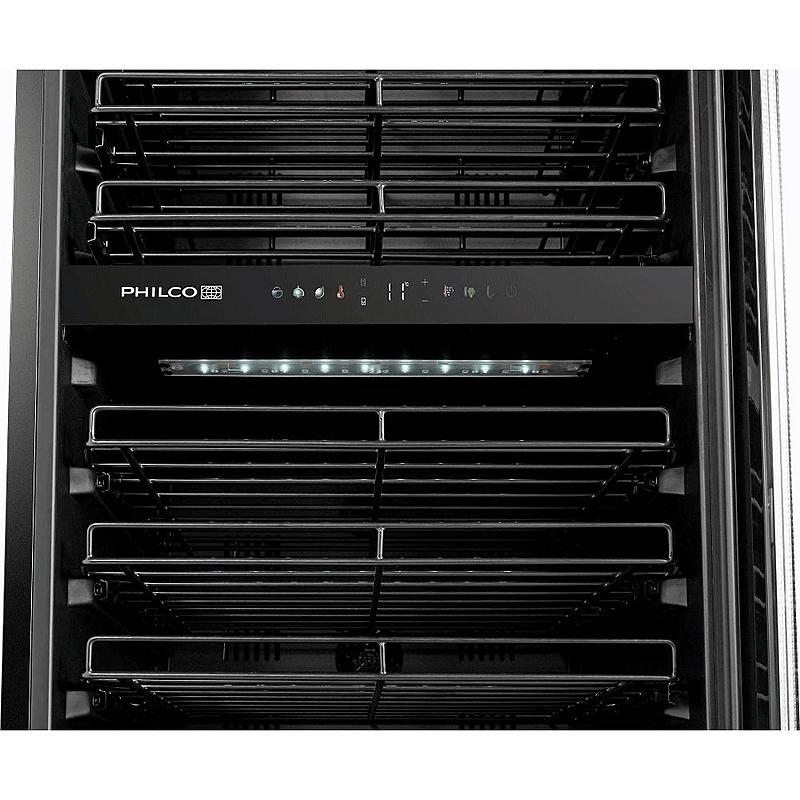 Dvouzónová kompresorová vinotéka Philco s tichým chodem, UV ochranou a beznámrazovým systémem. LED osvětlení a kapacita 131 lahví.