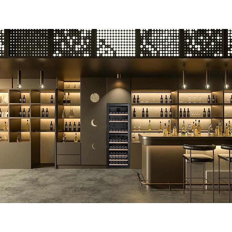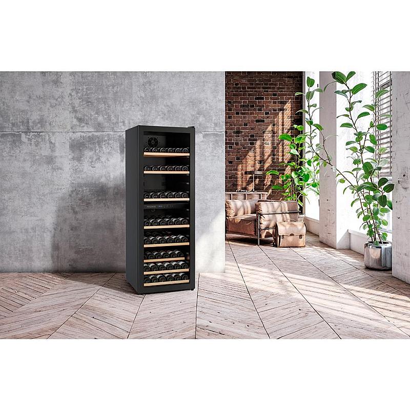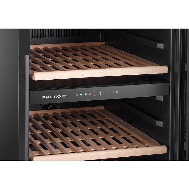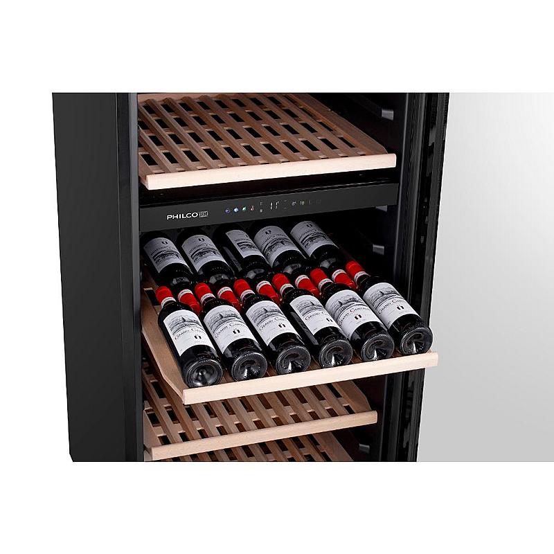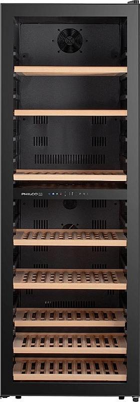 Dvouzónová vinotéka Philco s dřevěnými policemi, kompresorovým chlazením s tichým provozem a beznámrazovým systémem. Kapacita 171 lahví a uhlíkový filtr.