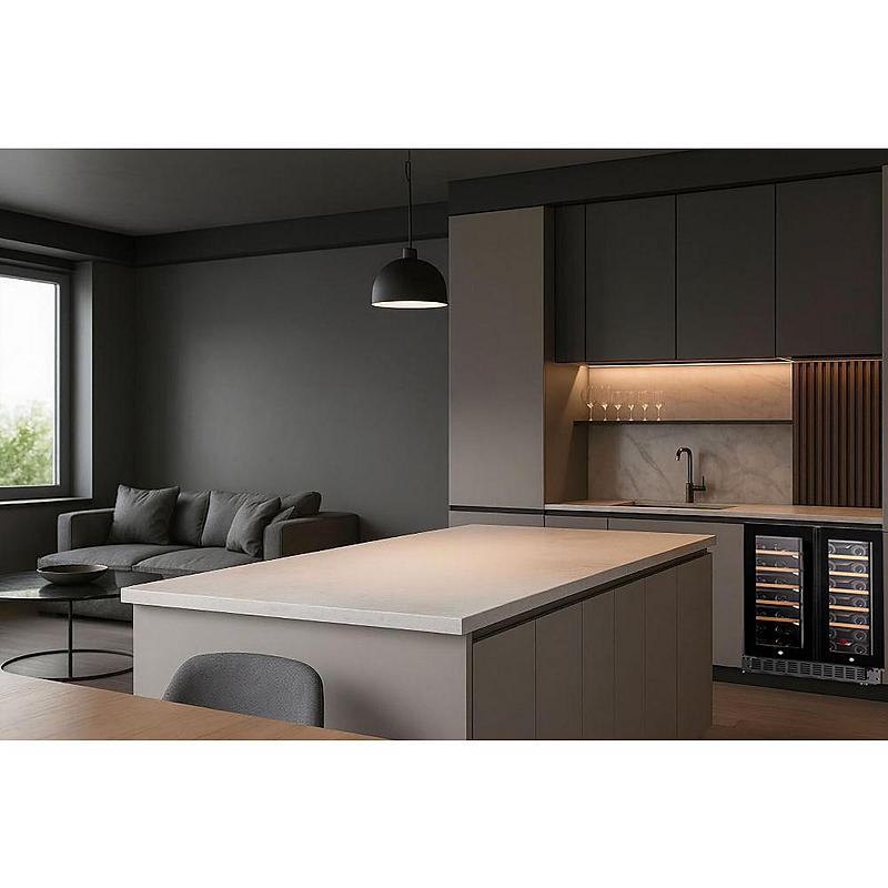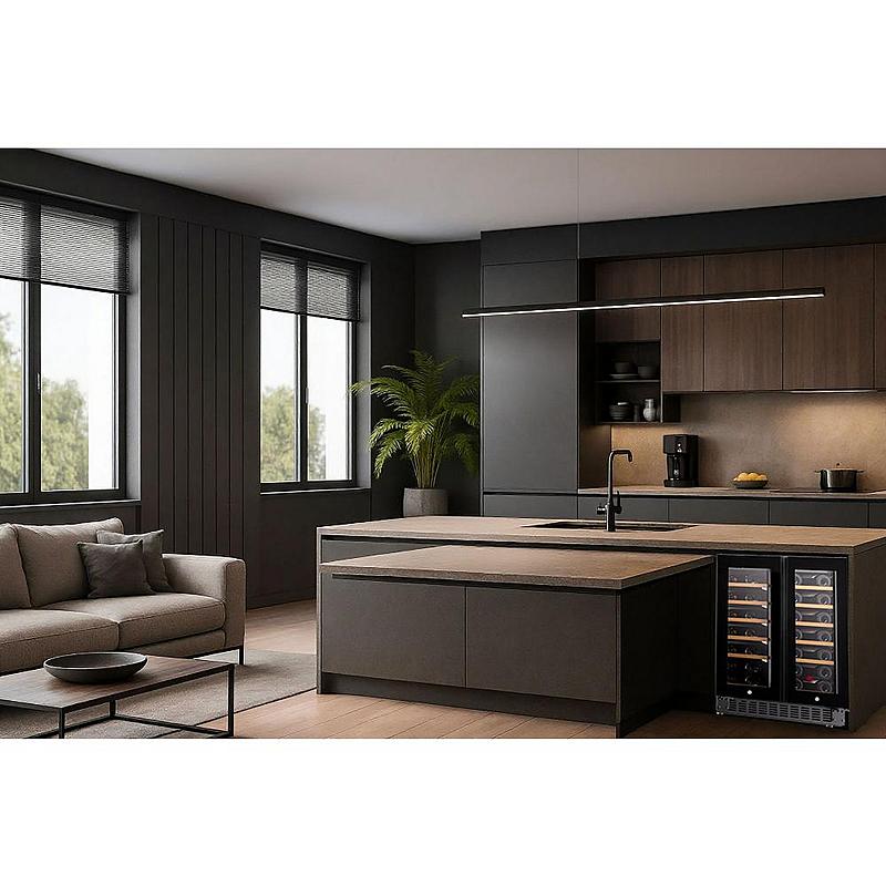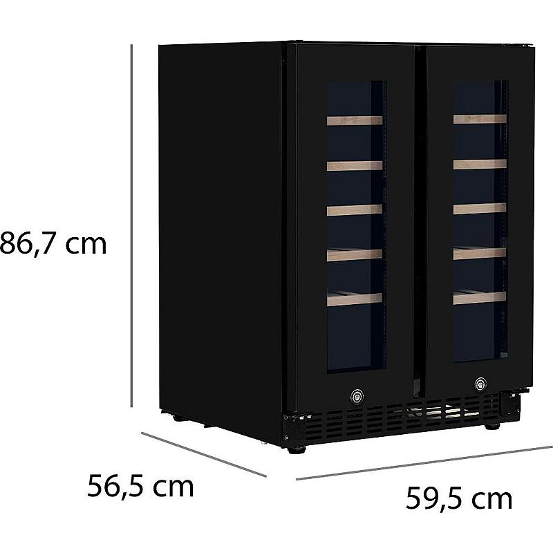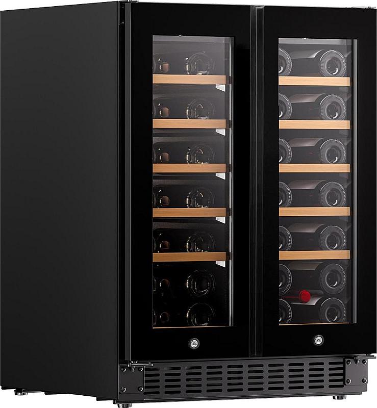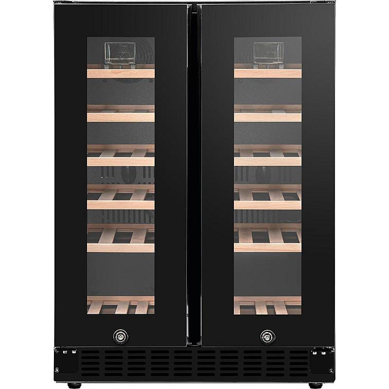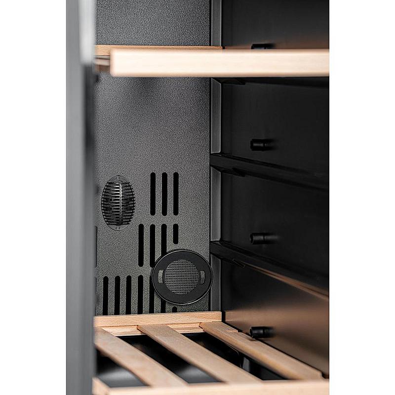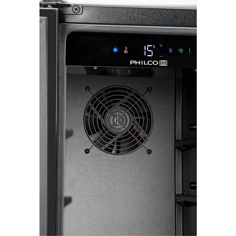 Kompaktní dvouzónová vinotéka Philco s aktivním ventilátorem, uhlíkovým filtrem a ochranou před UV zářením. Beznámrazový systém WinterCare a kapacita 40 lahví.