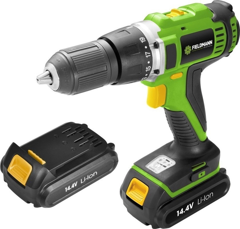 Dvourychlostní aku-vrtačka Fieldmann s příklepem a plastovým kufříkem. Li-Ion akumulátor Fieldmann s kapacitou 1300 mAh.