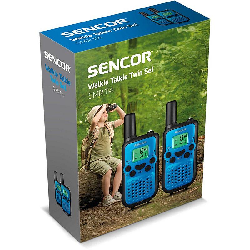 Sada dvou vysílaček Sencor s 8 základními kanály, podsvíceným displejem a vysílacím výkonem 0,5 W.