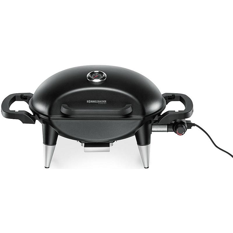 Elektrický gril Rommelsbacher s vyjímatelnou odkapávací miskou, nastavitelnou teplotou až do 300 °C a příkonem 2200 W.