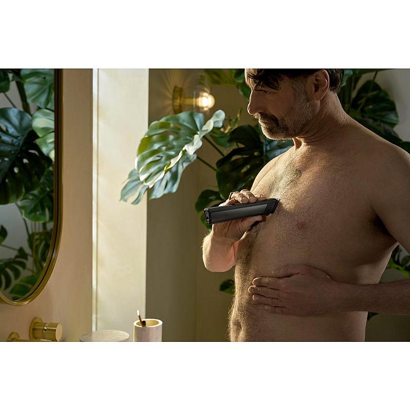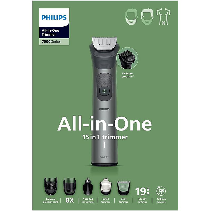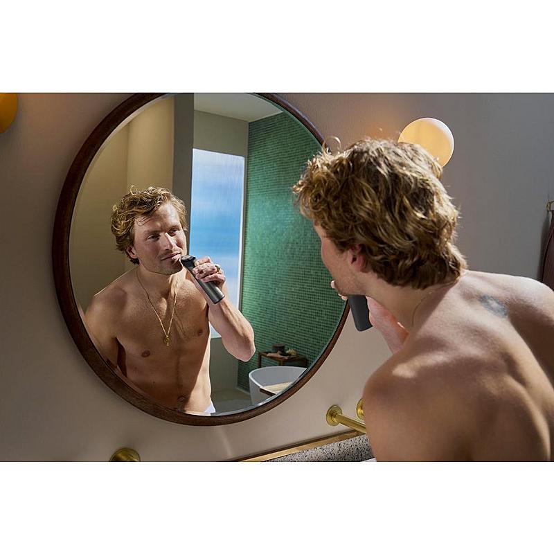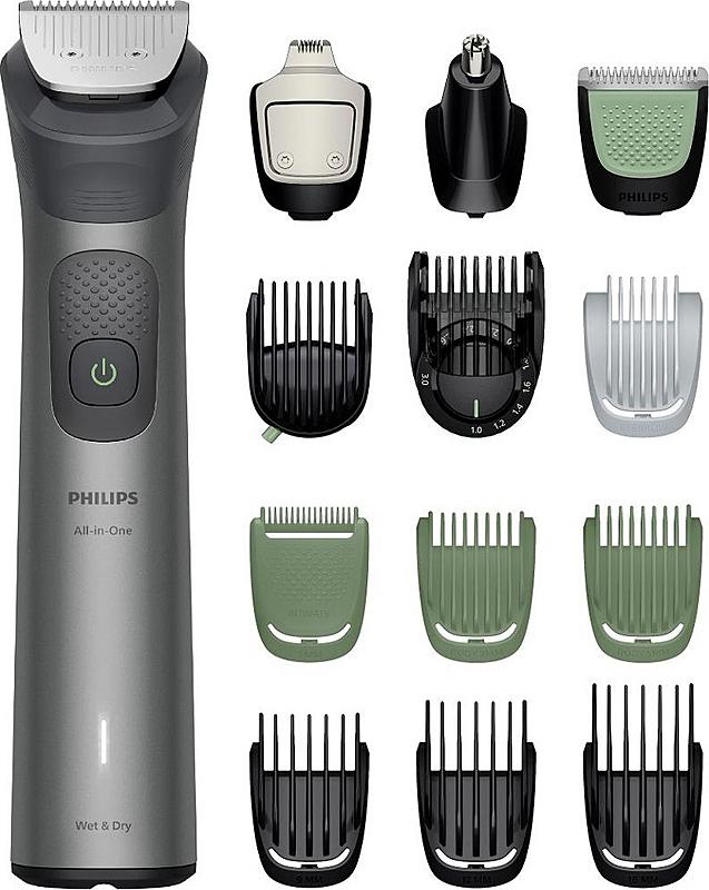 Multifunkční zastřihovač Philips se samoostřícími celokovovými břity, 14 výměnnými nástavci a indikátorem nabíjení.
