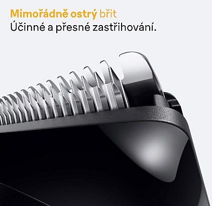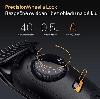 Voděodolný zastřihovač vousů Braun se zámkem a otočným ovladačem nastavení délky.