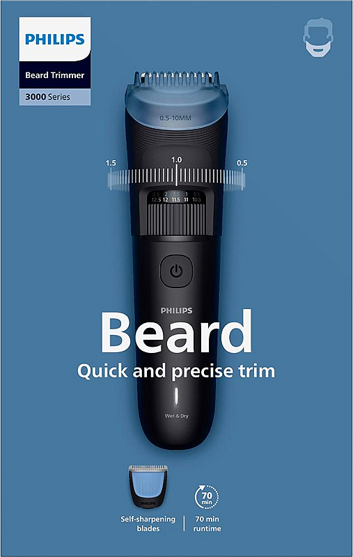 Zastřihovač vousů Philips s dvěma nástavci, dobou provozu až 70 minut a samoostřicími celokovovými břity